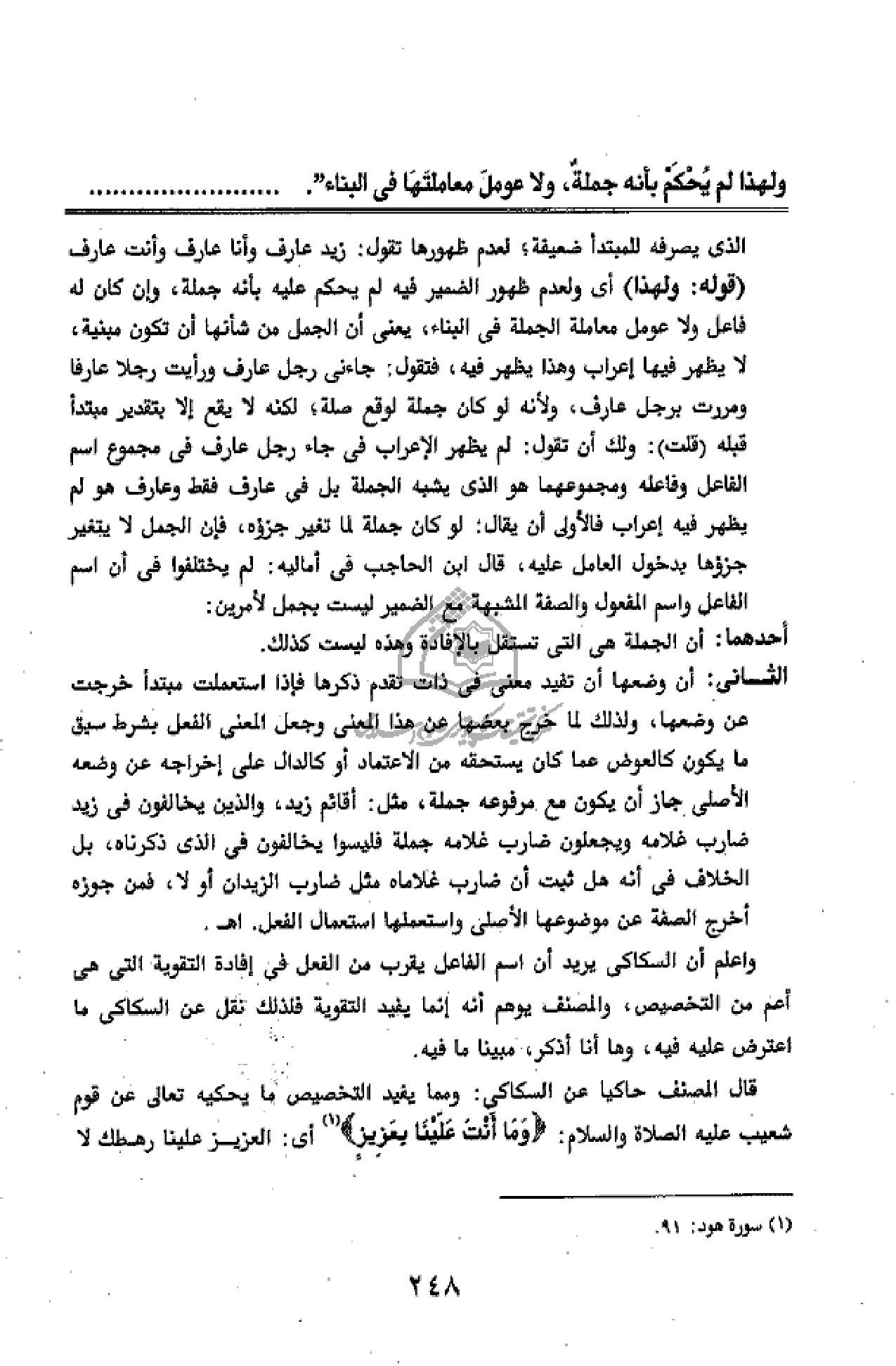 واعلم أن السكاكى يريد أن اسم الفاعل يقرب من الفعل فى إفادة التقوية التى هى أعم من التخصيص، والمصنف يوهم أنه إنما يفيد التقوية فلذلك نقل عن السكاكى ما اعترض عليه فيه، وها أنا أذكر، مبينا ما فيه.