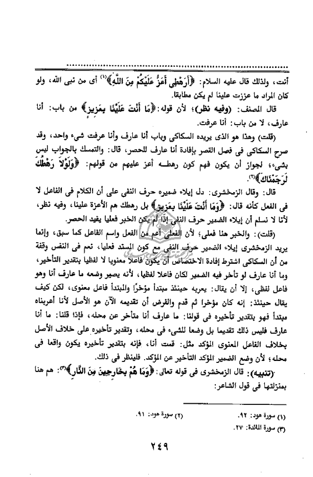 قال: وقال الزمخشرى: دل إيلاء ضميره حرف النفى على أن الكلام فى الفاعل لا فى الفعل كأنه قال: وَما أَنْتَ عَلَيْنا بِعَزِيزٍ بل رهطك هم الأعزة علينا، وفيه نظر، لأنا لا نسلم أن إيلاء الضمير حرف النفى إذا لم يكن الخبر فعليا يفيد الحصر.