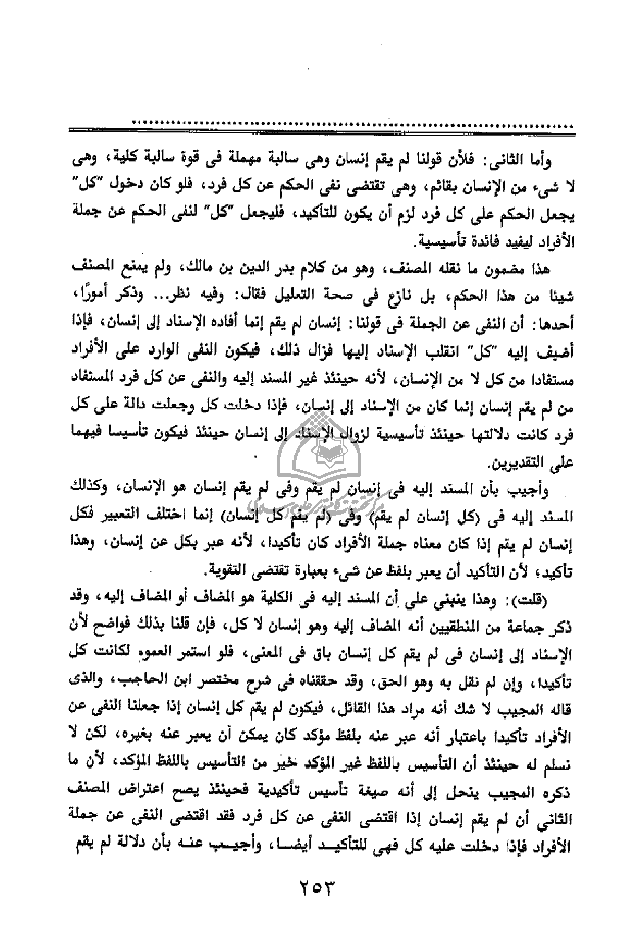 وأما الثانى: فلأن قولنا لم يقم إنسان وهى سالبة مهملة فى قوة سالبة كلية، وهى لا شئ من الإنسان بقائم، وهى تقتضى نفى الحكم عن كل فرد، فلو كان دخول" كل" يجعل الحكم على كل فرد لزم أن يكون للتأكيد، فليجعل" كل" لنفى الحكم عن جملة الأفراد ليفيد فائدة تأسيسية.