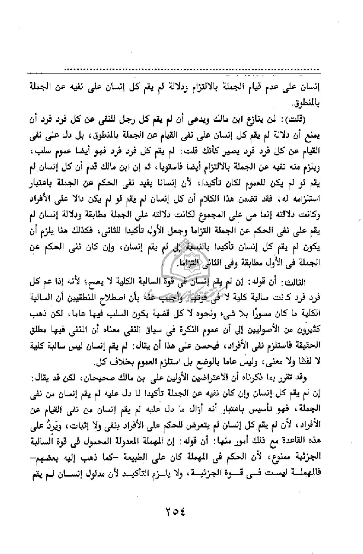 الثالث: أن قوله: إن لم يقم إنسان فى قوة السالبة الكلية لا يصح؛ لأنه إذا عم كل فرد فرد كانت سالبة كلية لا فى قوتها. وأجيب عنه بأن اصطلاح المنطقيين أن السالبة الكلية ما كان مسورا بلا شئ ونحوه لا كل قضية يكون السلب فيها عاما، لكن ذهب كثيرون من الأصوليين إلى أن عموم النكرة فى سياق النفى معناه أن المنفى فيها مطلق الحقيقة فاستلزم نفى الأفراد، فيحسن على هذا أن يقال: لم يقم إنسان ليس سالبة كلية لا لفظا ولا معنى، وليس عاما بالوضع بل استلزم العموم بخلاف كل.