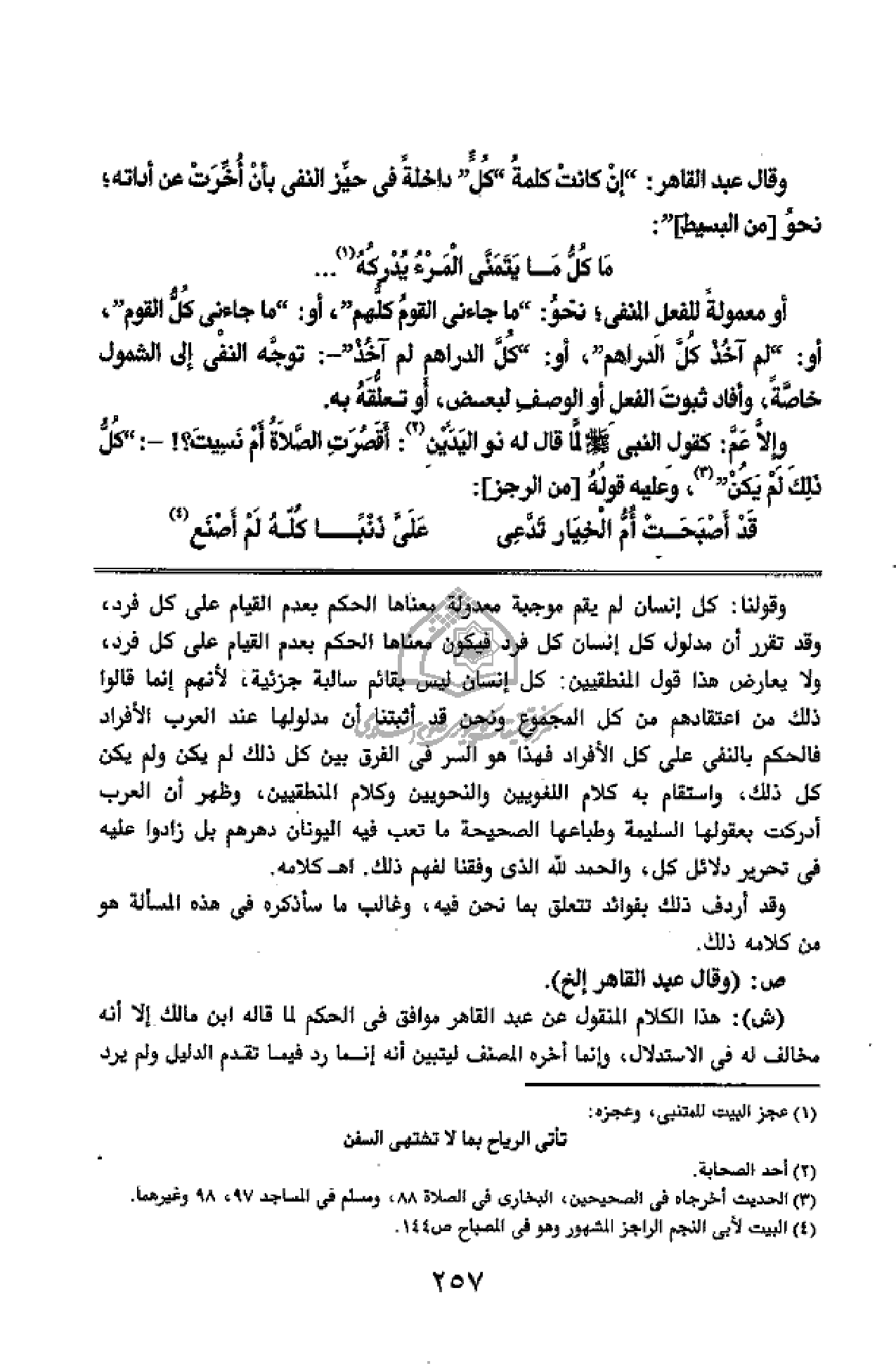 وقولنا: كل إنسان لم يقم موجبة معدولة معناها الحكم بعدم القيام على كل فرد، وقد تقرر أن مدلول كل إنسان كل فرد فيكون معناها الحكم بعدم القيام على كل فرد، ولا يعارض هذا قول المنطقيين: كل إنسان ليس بقائم سالبة جزئية، لأنهم إنما قالوا ذلك من اعتقادهم من كل المجموع ونحن قد أثبتنا أن مدلولها عند العرب الأفراد فالحكم بالنفى على كل الأفراد فهذا هو السر فى الفرق بين كل ذلك لم يكن ولم يكن كل ذلك، واستقام به كلام اللغويين والنحويين وكلام المنطقيين، وظهر أن العرب أدركت بعقولها السليمة وطباعها الصحيحة ما تعب فيه اليونان دهرهم بل زادوا عليه فى تحرير دلائل كل، والحمد لله الذى وفقنا لفهم ذلك. اه كلامه.