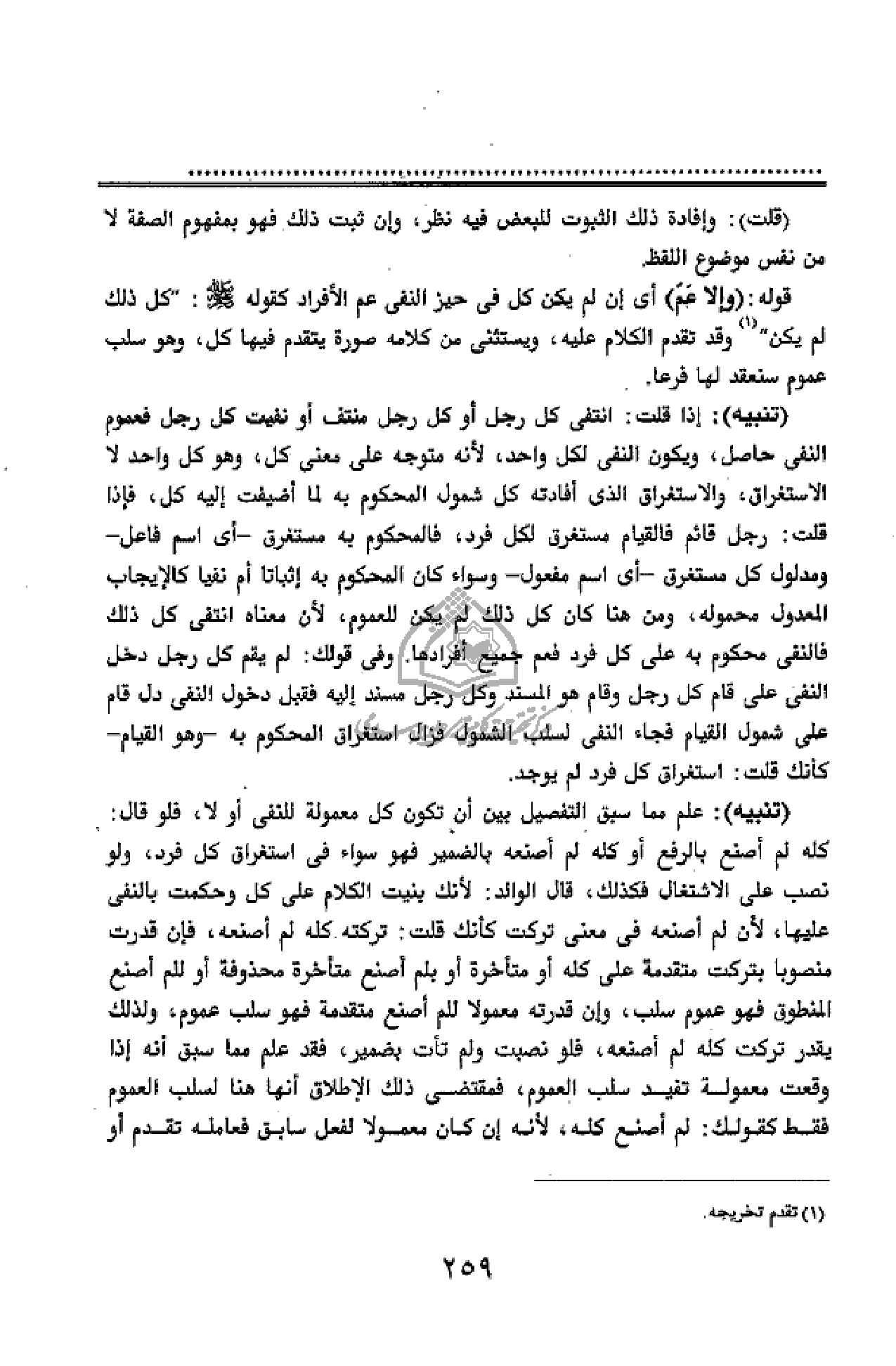 (تنبيه): إذا قلت: انتفى كل رجل أو كل رجل منتف أو نفيت كل رجل فعموم النفى حاصل، ويكون النفى لكل واحد، لأنه متوجه على معنى كل، وهو كل واحد لا الاستغراق، والاستغراق الذى أفادته كل شمول المحكوم به لما أضيفت إليه كل، فإذا قلت: رجل قائم فالقيام مستغرق لكل فرد، فالمحكوم به مستغرق - أى اسم فاعل - ومدلول كل مستغرق - أى اسم مفعول - وسواء كان المحكوم به إثباتا أم نفيا كالإيجاب المعدول محموله، ومن هنا كان كل ذلك لم يكن للعموم، لأن معناه انتفى كل ذلك فالنفى محكوم به على كل فرد فعم جميع أفرادها. وفى قولك: لم يقم كل رجل دخل النفى على قام كل رجل وقام هو المسند وكل رجل مسند إليه فقبل دخول النفى دل قام على شمول القيام فجاء النفى لسلب الشمول فزال استغراق المحكوم به - وهو القيام - كأنك قلت: استغراق كل فرد لم يوجد.