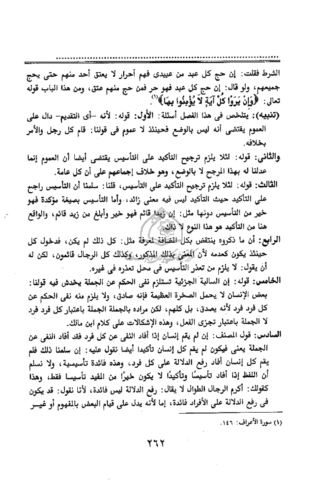 السادس: قول المصنف: إن لم يقم إنسان إذا أفاد النفى عن كل فرد فقد أفاد النفى عن الجملة يعنى فيكون لم يقم كل إنسان تأكيدا أيضا نقول عليه: إن سلمنا ذلك فلم يقم كل إنسان أفاد رفع الدلالة على كل فرد، وهذه فائدة تأسيسية، ولا نسلم أن اللفظ إذا أفاد تأسيسا وتأكيدا لا يكون خيرا من المفيد تأسيسا فقط، وهذا كقولك: أكرم الرجال الطوال لا يقال: رفع الدلالة ليس فائدة، لأنا نقول: قد يكون فى رفع الدلالة على الأفراد فائدة، إما لأنه يدل على قيام البعض بالمفهوم أو غير