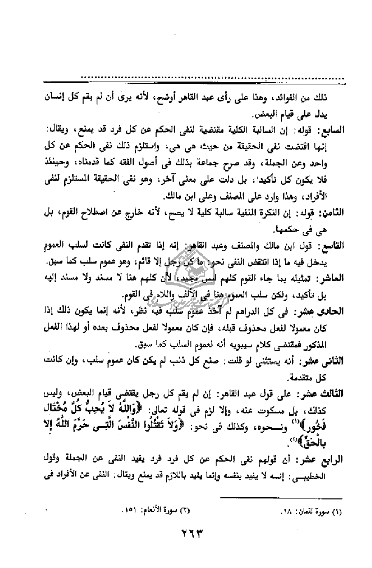 الثامن: قوله: إن النكرة المنفية سالبة كلية لا يصح، لأنه خارج عن اصطلاح القوم، بل هى فى حكمها.