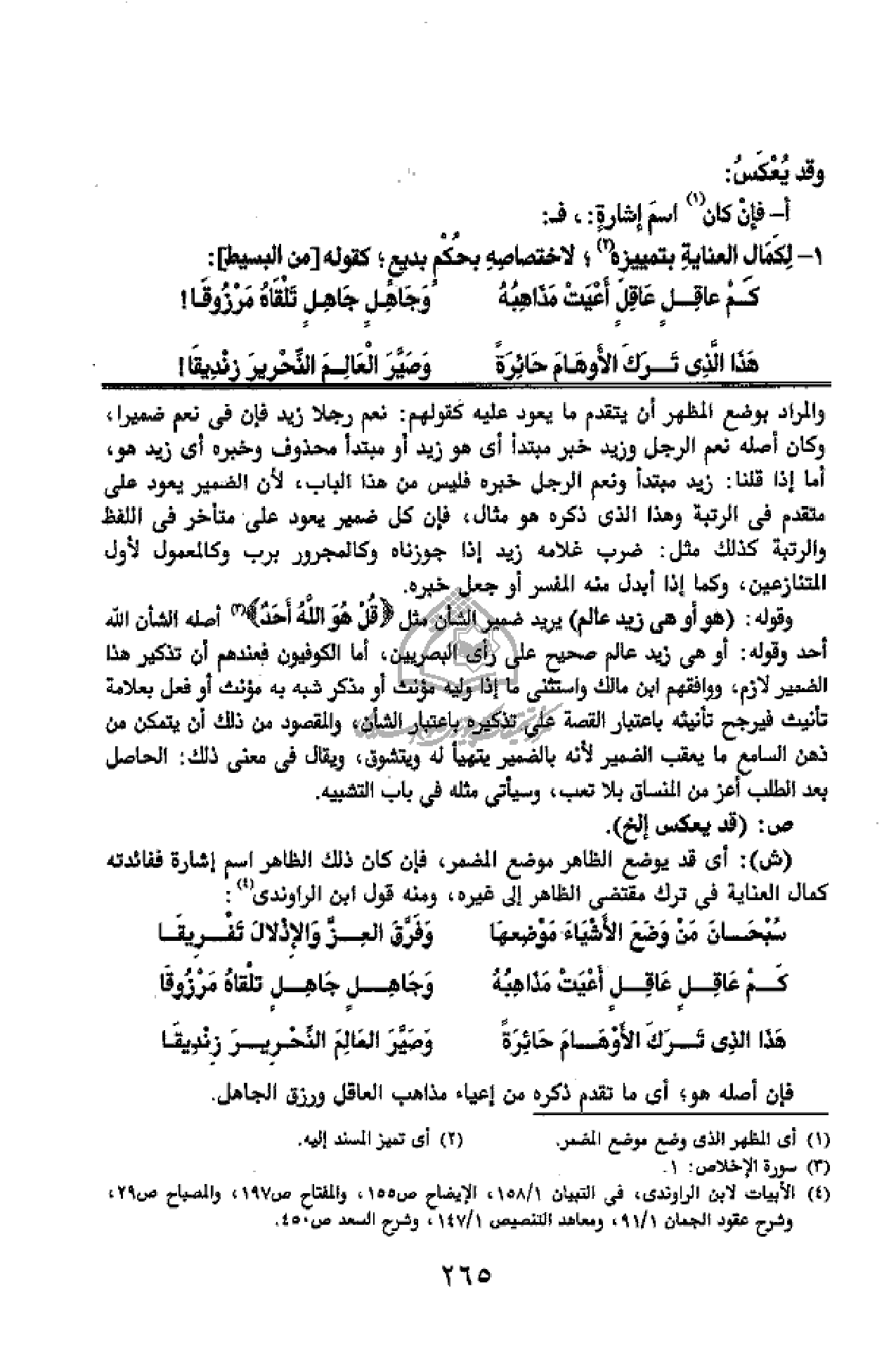 (ش): أى قد يوضع الظاهر موضع المضمر، فإن كان ذلك الظاهر اسم إشارة ففائدته كمال العناية فى ترك مقتضى الظاهر إلى غيره، ومنه قول ابن الراوندى (¬4):