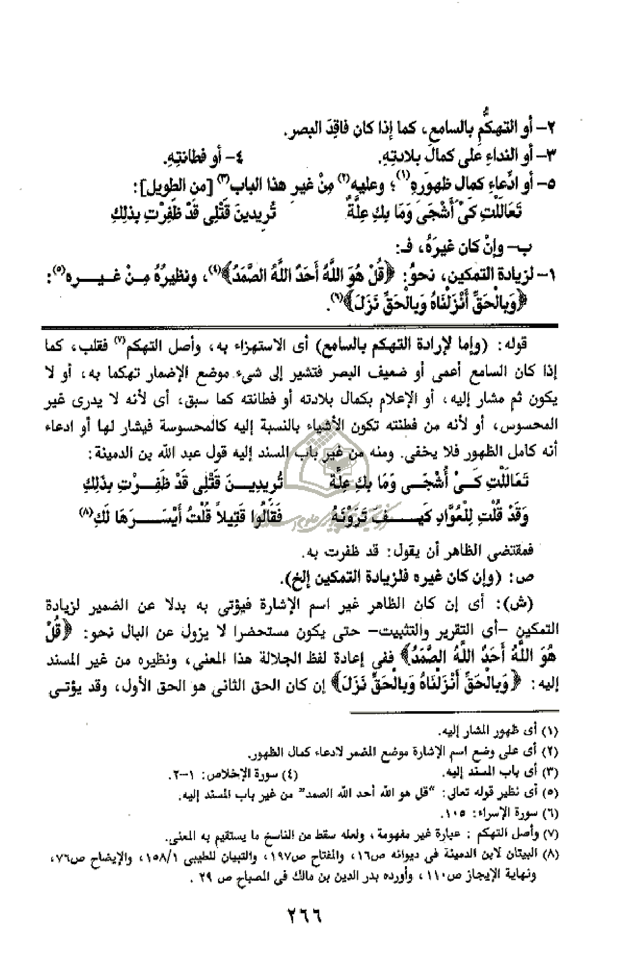(ش): أى إن كان الظاهر غير اسم الإشارة فيؤتى به بدلا عن الضمير لزيادة التمكين - أى التقرير والتثبيت - حتى يكون مستحضرا لا يزول عن البال نحو: قُلْ هُوَ اللَّهُ أَحَدٌ اللَّهُ الصَّمَدُ ففى إعادة لفظ الجلالة هذا المعنى، ونظيره من غير المسند إليه: وَبِالْحَقِّ أَنْزَلْناهُ وَبِالْحَقِّ نَزَلَ إن كان الحق الثانى هو الحق الأول، وقد يؤتى