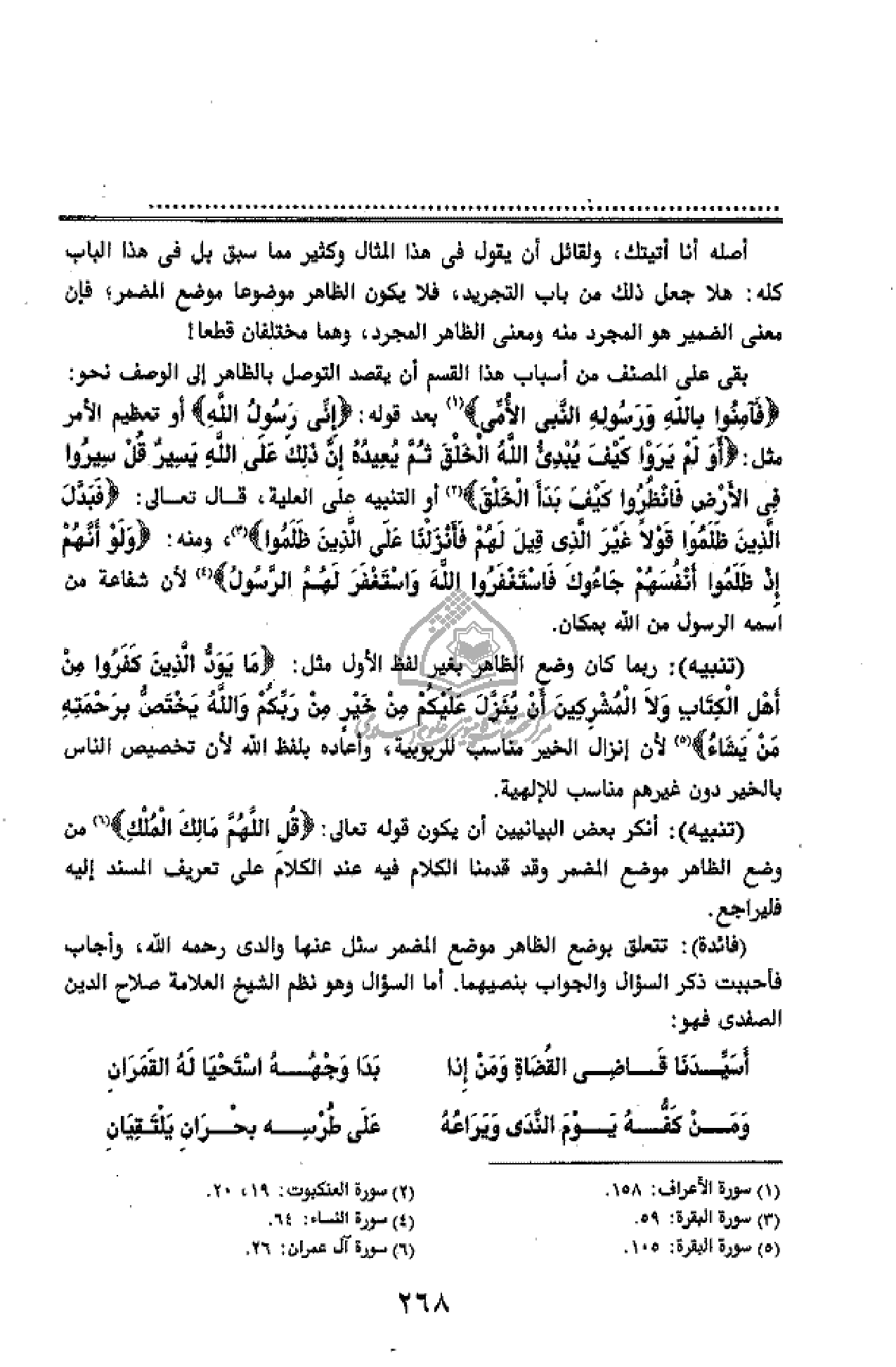 (فائدة): تتعلق بوضع الظاهر موضع المضمر سئل عنها والدى رحمه الله، وأجاب فأحببت ذكر السؤال والجواب بنصيهما. أما السؤال وهو نظم الشيخ العلامة صلاح الدين الصفدى فهو: