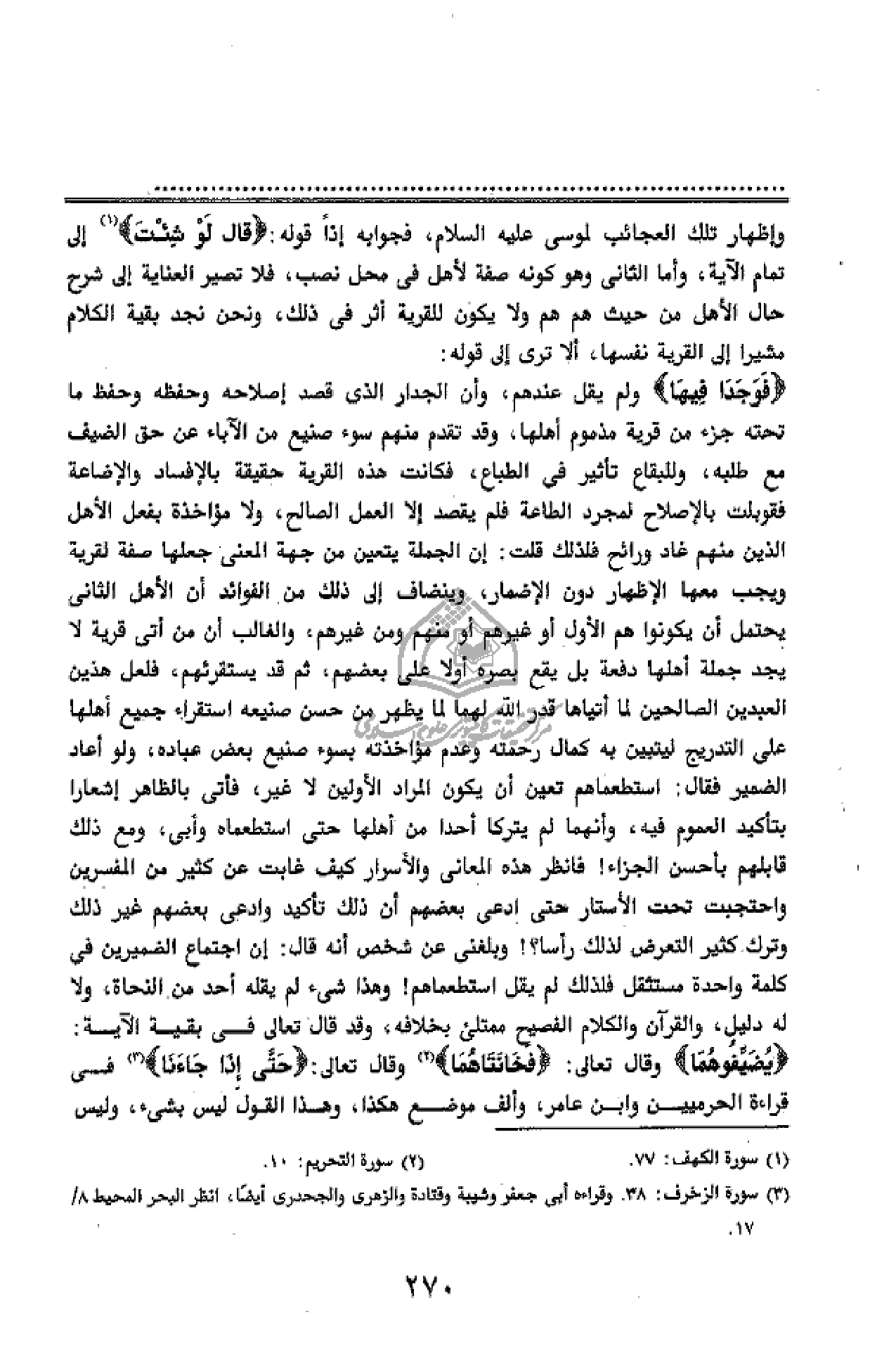 وإظهار تلك العجائب لموسى عليه السّلام، فجوابه إذا قوله: قالَ لَوْ شِئْتَ (¬1) إلى تمام الآية، وأما الثانى وهو كونه صفة لأهل فى محل نصب، فلا تصير العناية إلى شرح حال الأهل من حيث هم هم ولا يكون للقرية أثر فى ذلك، ونحن نجد بقية الكلام مشيرا إلى القرية نفسها، ألا ترى إلى قوله:
