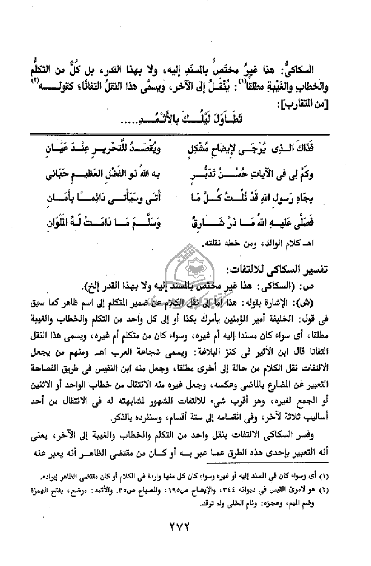 السكاكىّ: هذا غير مختصّ بالمسند إليه، ولا بهذا القدر، بل كلّ من التكلّم والخطاب والغيبة مطلقا (¬1): ينقل إلى الآخر، ويسمّى هذا النقل التفاتا؛ كقوله (¬2) [من المتقارب]: