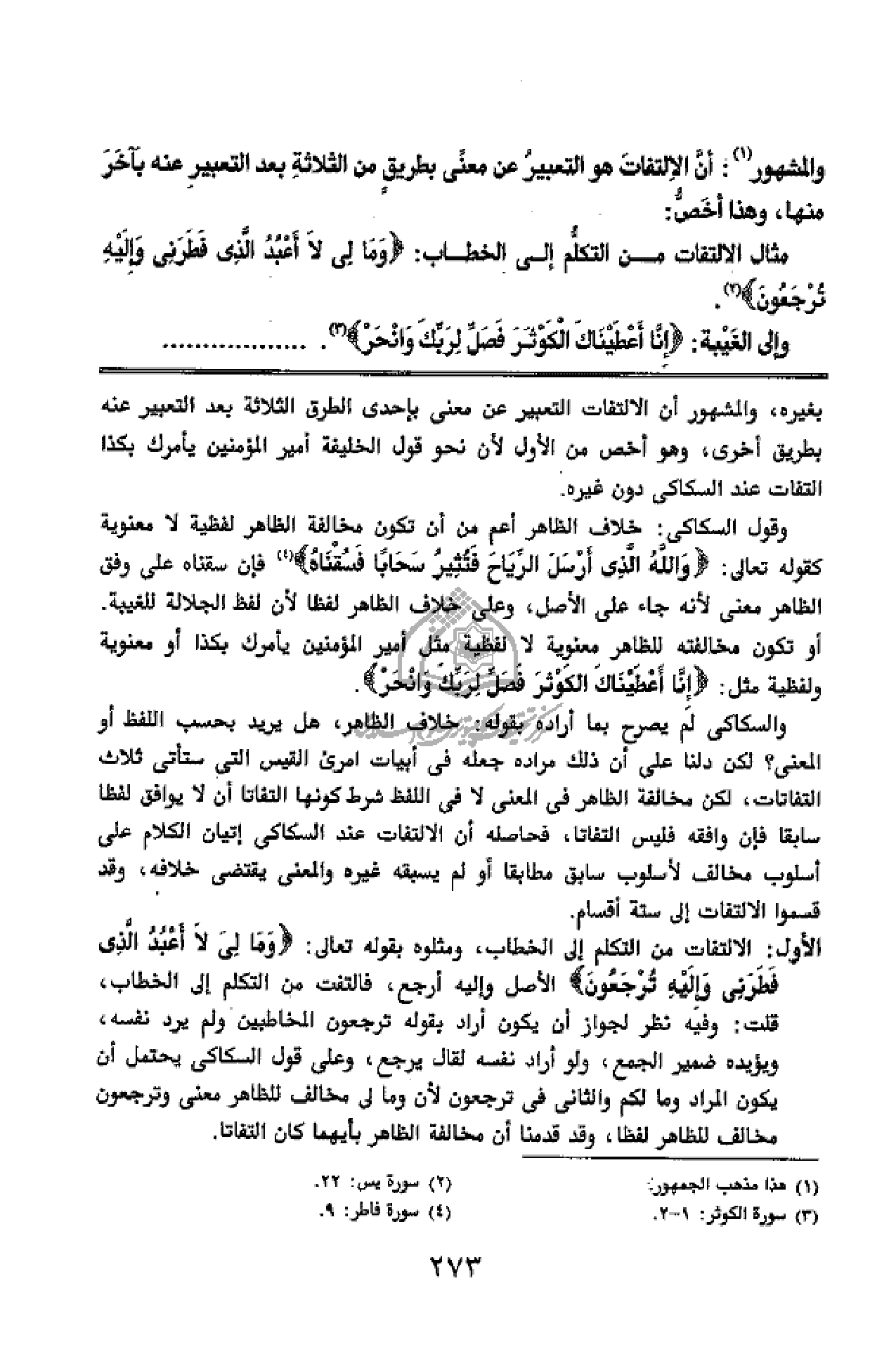مثال الالتفات من التكلّم إلى الخطاب: وَما لِيَ لا أَعْبُدُ الَّذِي فَطَرَنِي وَإِلَيْهِ تُرْجَعُونَ (¬2).