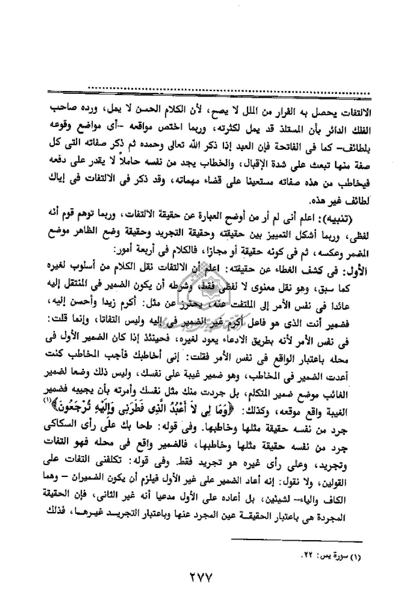 الأول: فى كشف الغطاء عن حقيقته: اعلم أن الالتفات نقل الكلام من أسلوب لغيره كما سبق، وهو نقل معنوى لا لفظى فقط، وشرطه أن يكون الضمير فى المنتقل إليه عائدا فى نفس الأمر إلى الملتفت عنه، يحترز عن مثل: أكرم زيدا وأحسن إليه، فضمير أنت الذى هو فاعل أكرم غير الضمير فى إليه وليس التفاتا، وإنما قلت: