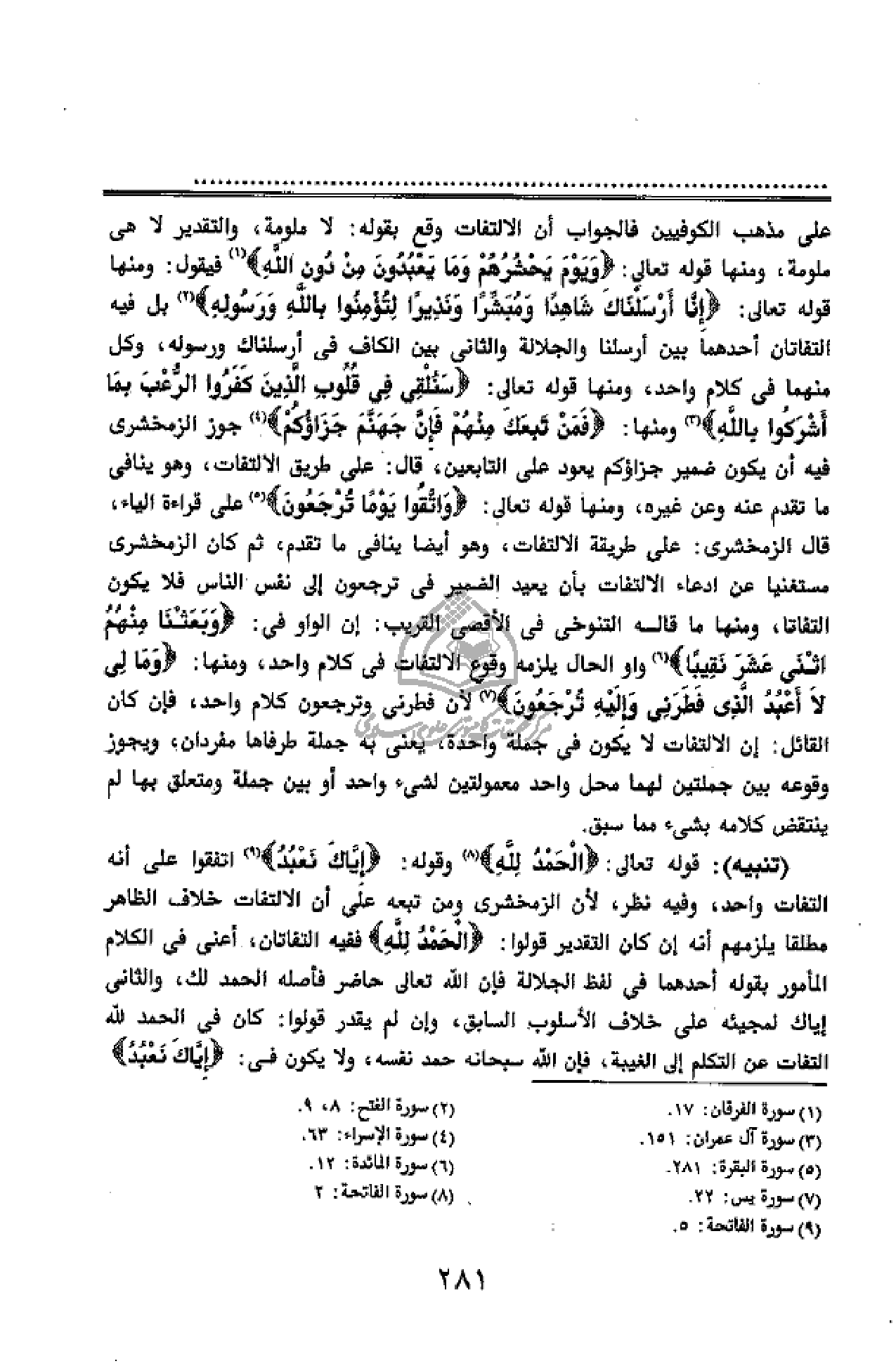 (تنبيه): قوله تعالى: الْحَمْدُ لِلَّهِ (¬8) وقوله: إِيَّاكَ نَعْبُدُ (¬9) اتفقوا على أنه التفات واحد، وفيه نظر، لأن الزمخشرى ومن تبعه على أن الالتفات خلاف الظاهر مطلقا يلزمهم أنه إن كان التقدير قولوا: الْحَمْدُ لِلَّهِ ففيه التفاتان، أعنى فى الكلام المأمور بقوله أحدهما فى لفظ الجلالة فإن الله تعالى حاضر فأصله الحمد لك، والثانى إياك لمجيئه على خلاف الأسلوب السابق، وإن لم يقدر قولوا: كان فى الحمد لله التفات عن التكلم إلى الغيبة، فإن الله سبحانه حمد نفسه، ولا يكون فى: إِيَّاكَ نَعْبُدُ