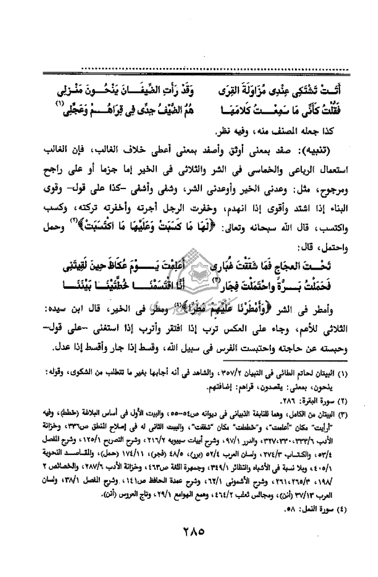 (تنبيه): صفد بمعنى أوثق وأصفد بمعنى أعطى خلاف الغالب، فإن الغالب استعمال الرباعى والخماسى فى الشر والثلاثى فى الخير إما جزما أو على راجح ومرجوح، مثل: وعدنى الخير وأوعدنى الشر، وشفى وأشفى - كذا على قول - وقوى البناء إذا اشتد وأقوى إذا انهدم، وخفرت الرجل أجرته وأخفرته تركته، وكسب واكتسب، قال الله سبحانه وتعالى: لَها ما كَسَبَتْ وَعَلَيْها مَا اكْتَسَبَتْ (¬2) وحمل واحتمل، قال: