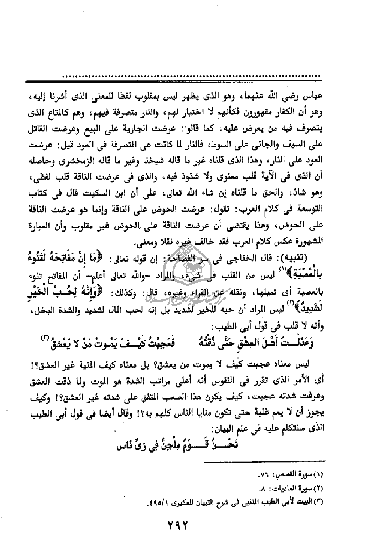(تنبيه): قال الخفاجى فى سر الفصاحة: إن قوله تعالى: ما إِنَّ مَفاتِحَهُ لَتَنُوأُ بِالْعُصْبَةِ (¬1) ليس من القلب فى شئ، والمراد - والله تعالى أعلم - أن المفاتح تنوء بالعصبة أى تميلها، ونقله عن الفراء وغيره، قال: وكذلك: وَإِنَّهُ لِحُبِّ الْخَيْرِ لَشَدِيدٌ (¬2) ليس المراد أن حبه للخير لشديد بل إنه لحب المال لشديد والشدة البخل، وأنه لا قلب فى قول أبى الطيب: