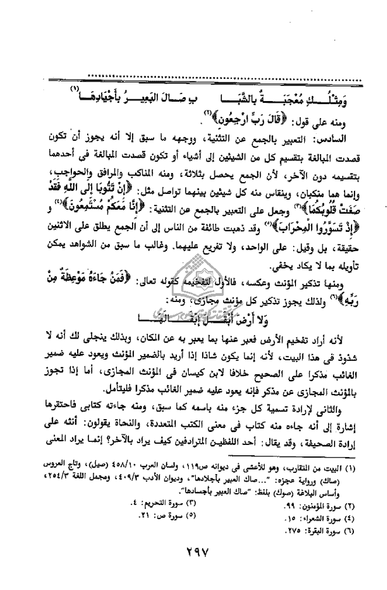 والثانى لإرادة تسمية كل جزء منه باسمه كما سبق، ومنه جاءته كتابى فاحتقرها إشارة إلى أنه جاءه منه كتاب فى معنى الكتب المتعددة، والنحاة يقولون: أنثه على إرادة الصحيفة، وقد يقال: أحد اللفظين المترادفين كيف يراد بالآخر؟ إنما يراد المعنى