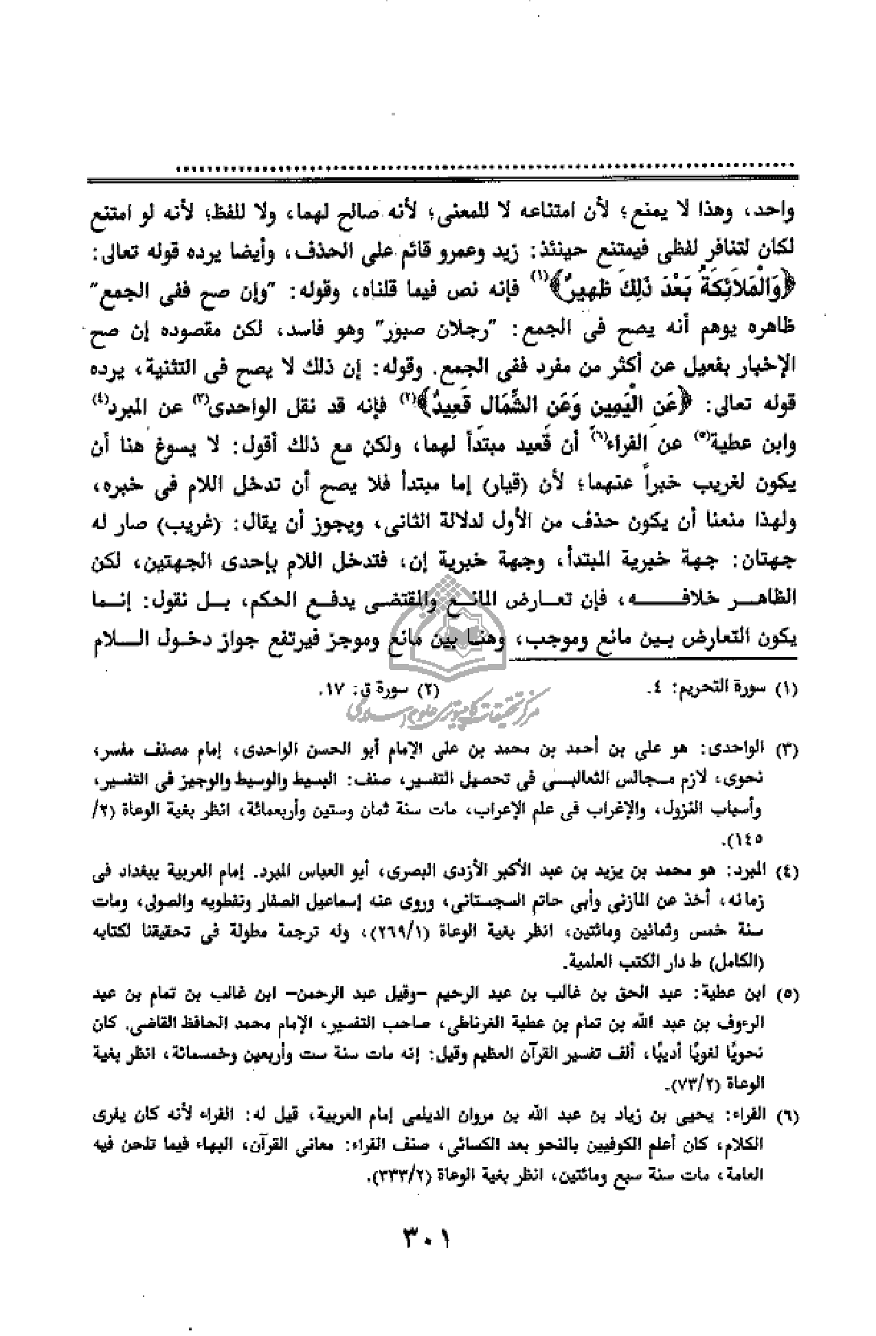 وَالْمَلائِكَةُ بَعْدَ ذلِكَ ظَهِيرٌ (¬1) فإنه نص فيما قلناه، وقوله:" وإن صح ففى الجمع" ظاهره يوهم أنه يصح فى الجمع:" رجلان صبور" وهو فاسد، لكن مقصوده إن صح الإخبار بفعيل عن أكثر من مفرد ففى الجمع. وقوله: إن ذلك لا يصح فى التثنية، يرده قوله تعالى: عَنِ الْيَمِينِ وَعَنِ الشِّمالِ قَعِيدٌ (¬2) فإنه قد نقل الواحدى (¬3) عن المبرد (¬4) وابن عطية (¬5) عن الفراء (¬6) أن قعيد مبتدأ لهما، ولكن مع ذلك أقول: لا يسوغ هنا أن يكون لغريب خبرا عنهما؛ لأن (قيار) إما مبتدأ فلا يصح أن تدخل اللام فى خبره، ولهذا منعنا أن يكون حذف من الأول لدلالة الثانى، ويجوز أن يقال: (غريب) صار له جهتان: جهة خبرية المبتدأ، وجهة خبرية إن، فتدخل اللام بإحدى الجهتين، لكن الظاهر خلافه، فإن تعارض المانع والمقتضى يدفع الحكم، بل نقول: إنما يكون التعارض بين مانع وموجب، وهنا بين مانع وموجز فيرتفع جواز دخول اللام