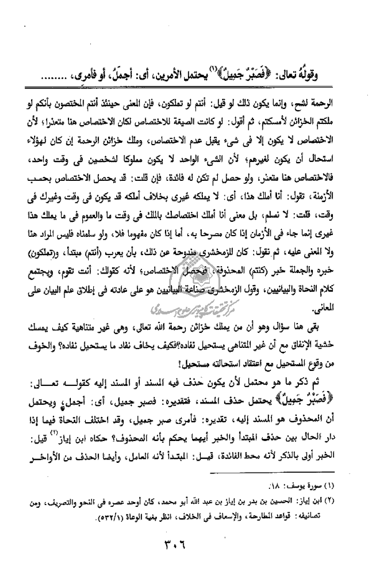 فَصَبْرٌ جَمِيلٌ * يحتمل حذف المسند، فتقديره: فصبر جميل، أى: أجمل، ويحتمل أن المحذوف هو المسند إليه، تقديره: فأمرى صبر جميل، وقد اختلف النحاة فيما إذا دار الحال بين حذف المبتدأ والخبر أيهما يحكم بأنه المحذوف؟ حكاه ابن إياز (¬2) قيل: