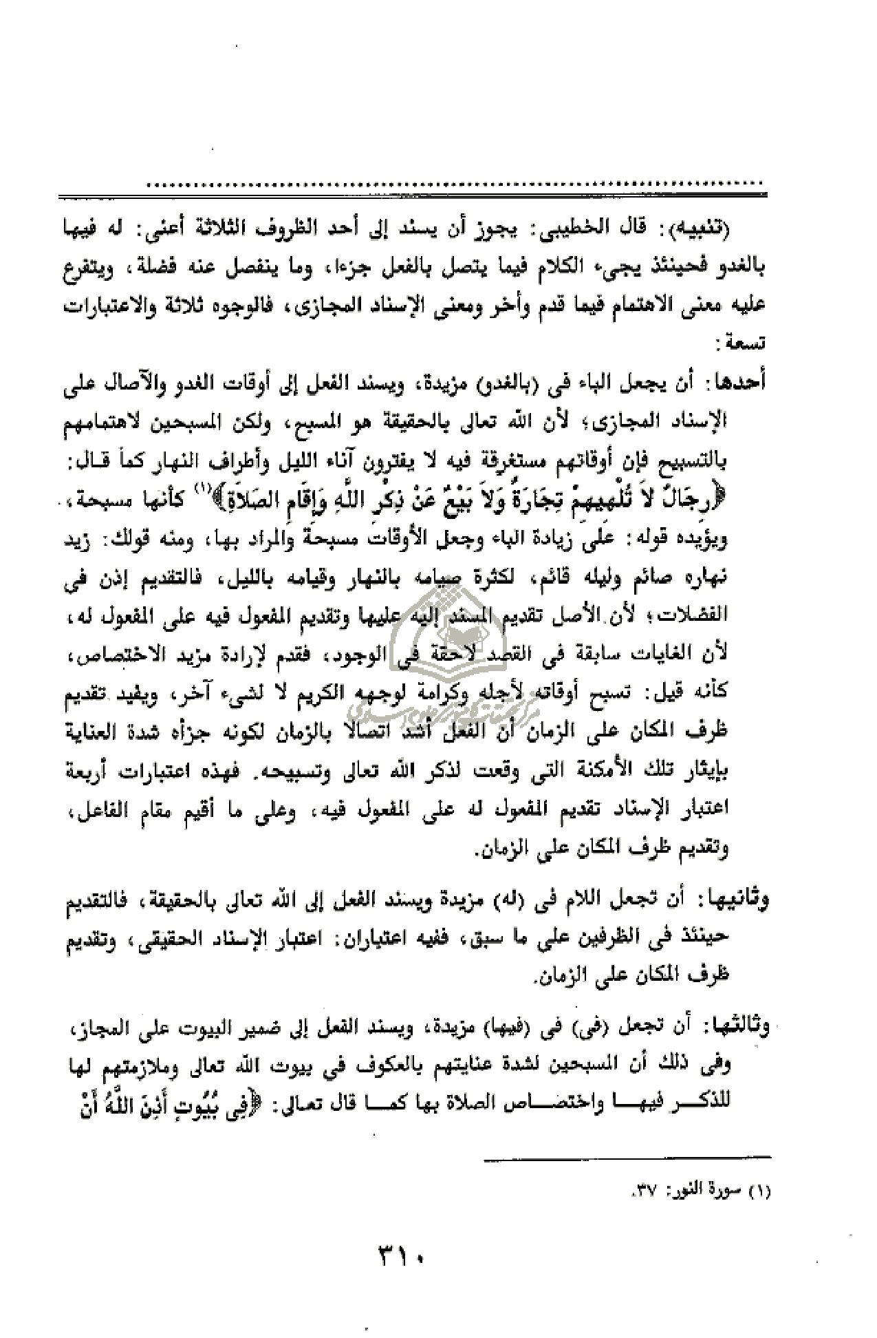 رِجالٌ لا تُلْهِيهِمْ تِجارَةٌ وَلا بَيْعٌ عَنْ ذِكْرِ اللَّهِ وَإِقامِ الصَّلاةِ (¬1) كأنها مسبحة، ويؤيده قوله: على زيادة الباء وجعل الأوقات مسبحة والمراد بها، ومنه قولك: زيد نهاره صائم وليله قائم، لكثرة صيامه بالنهار وقيامه بالليل، فالتقديم إذن فى الفضلات؛ لأن الأصل تقديم المسند إليه عليها وتقديم المفعول فيه على المفعول له، لأن الغايات سابقة فى القصد لاحقة فى الوجود، فقدم لإرادة مزيد الاختصاص، كأنه قيل: تسبح أوقاته لأجله وكرامة لوجهه الكريم لا لشئ آخر، ويفيد تقديم ظرف المكان على الزمان أن الفعل أشد اتصالا بالزمان لكونه جزأه شدة العناية بإيثار تلك الأمكنة التى وقعت لذكر الله تعالى وتسبيحه. فهذه اعتبارات أربعة اعتبار الإسناد تقديم المفعول له على المفعول فيه، وعلى ما أقيم مقام الفاعل، وتقديم ظرف المكان على الزمان.