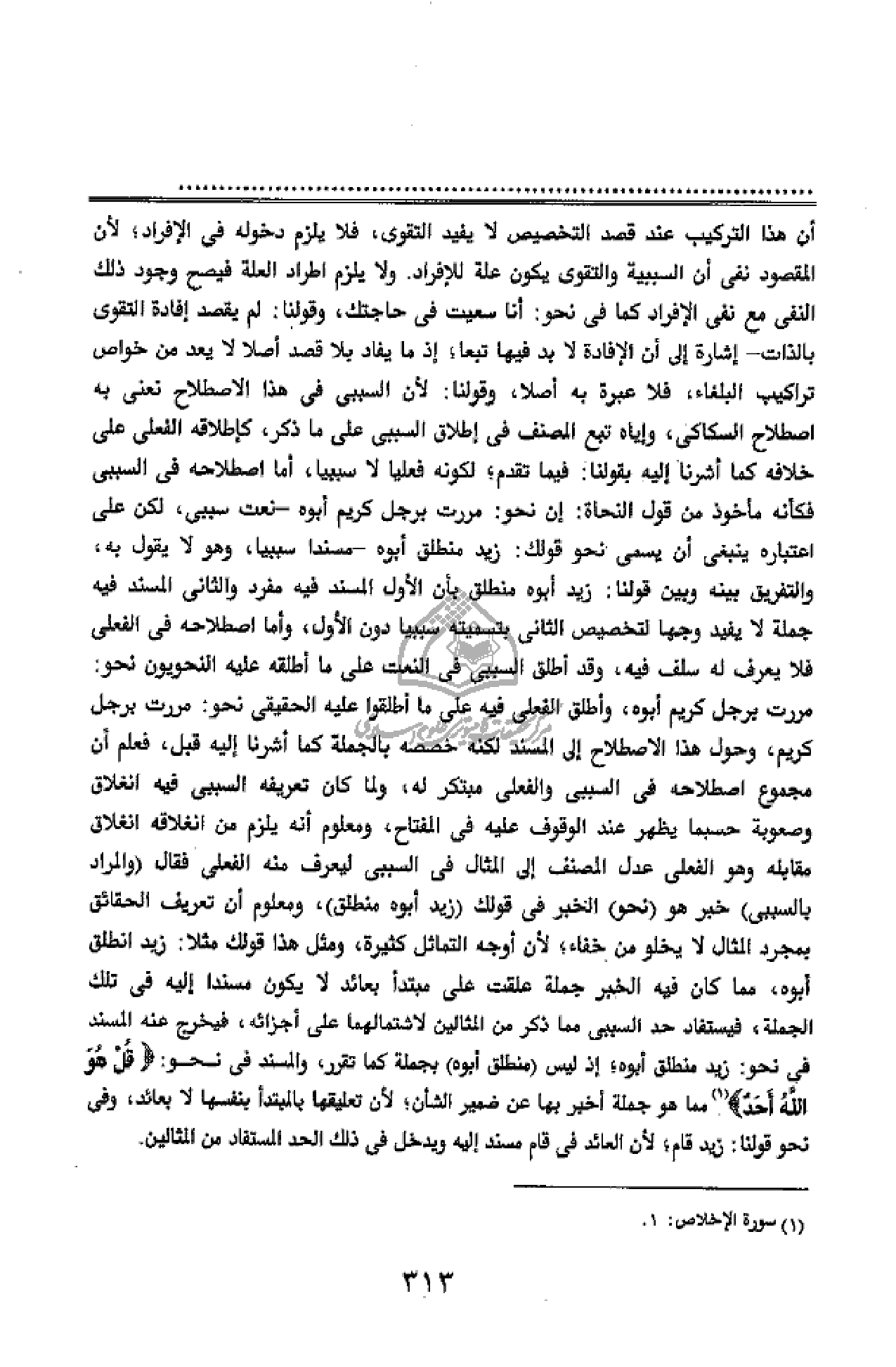 فيما تقدم؛ لكونه فعليا لا سببيا، أما اصطلاحه فى السببى فكأنه مأخوذ من قول النحاة: إن نحو: مررت برجل كريم أبوه - نعت سببى، لكن على اعتباره ينبغى أن يسمى نحو قولك: زيد منطلق أبوه - مسندا سببيا، وهو لا يقول به، والتفريق بينه وبين قولنا: زيد أبوه منطلق بأن الأول المسند فيه مفرد والثانى المسند فيه جملة لا يفيد وجها لتخصيص الثانى بتسميته سببيا دون الأول، وأما اصطلاحه فى الفعلى فلا يعرف له سلف فيه، وقد أطلق السببى فى النعت على ما أطلقه عليه النحويون نحو: