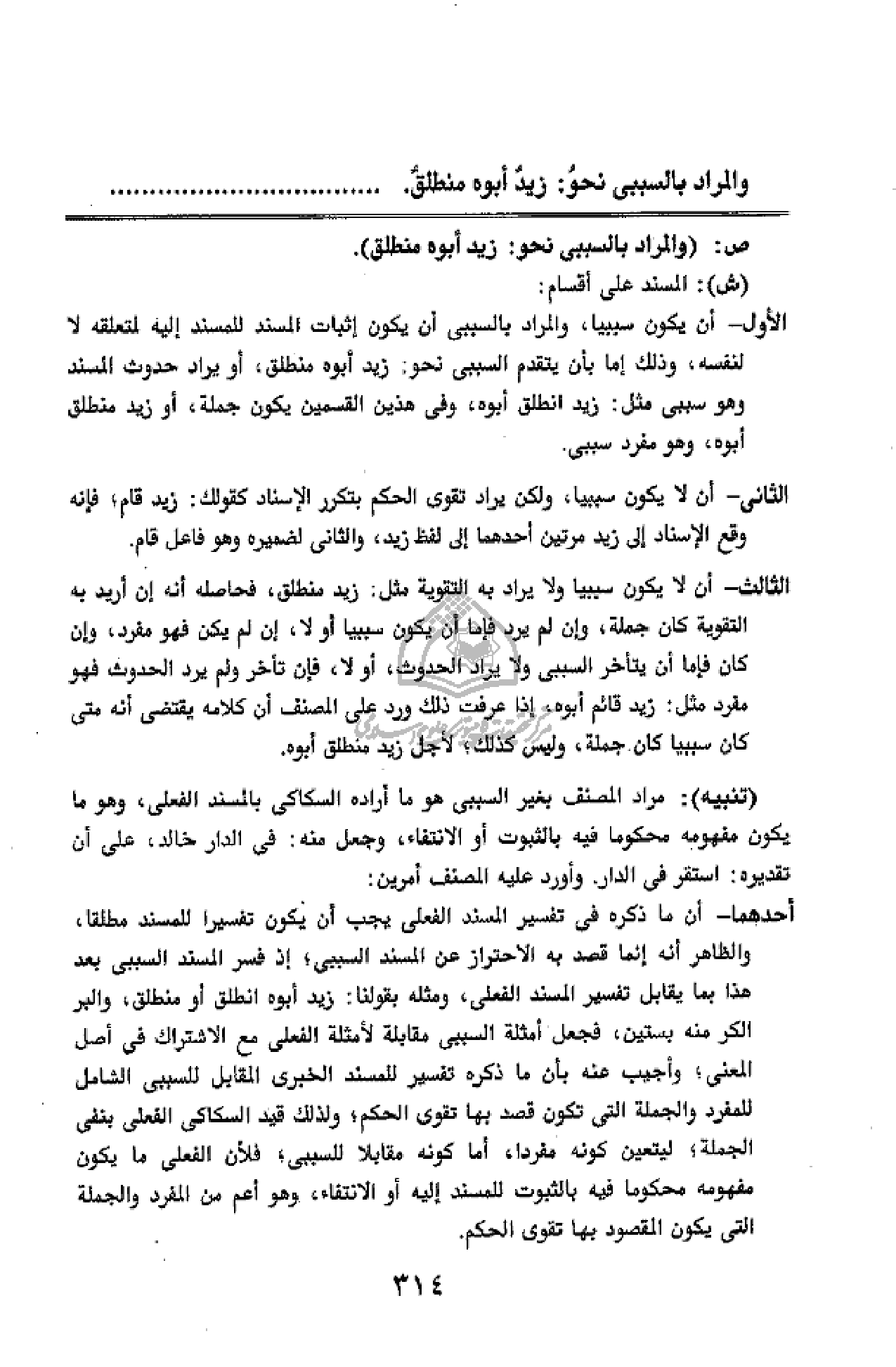 الأول - أن يكون سببيا، والمراد بالسببى أن يكون إثبات المسند للمسند إليه لمتعلقه لا لنفسه، وذلك إما بأن يتقدم السببى نحو: زيد أبوه منطلق، أو يراد حدوث المسند وهو سببى مثل: زيد انطلق أبوه، وفى هذين القسمين يكون جملة، أو زيد منطلق أبوه، وهو مفرد سببى.
