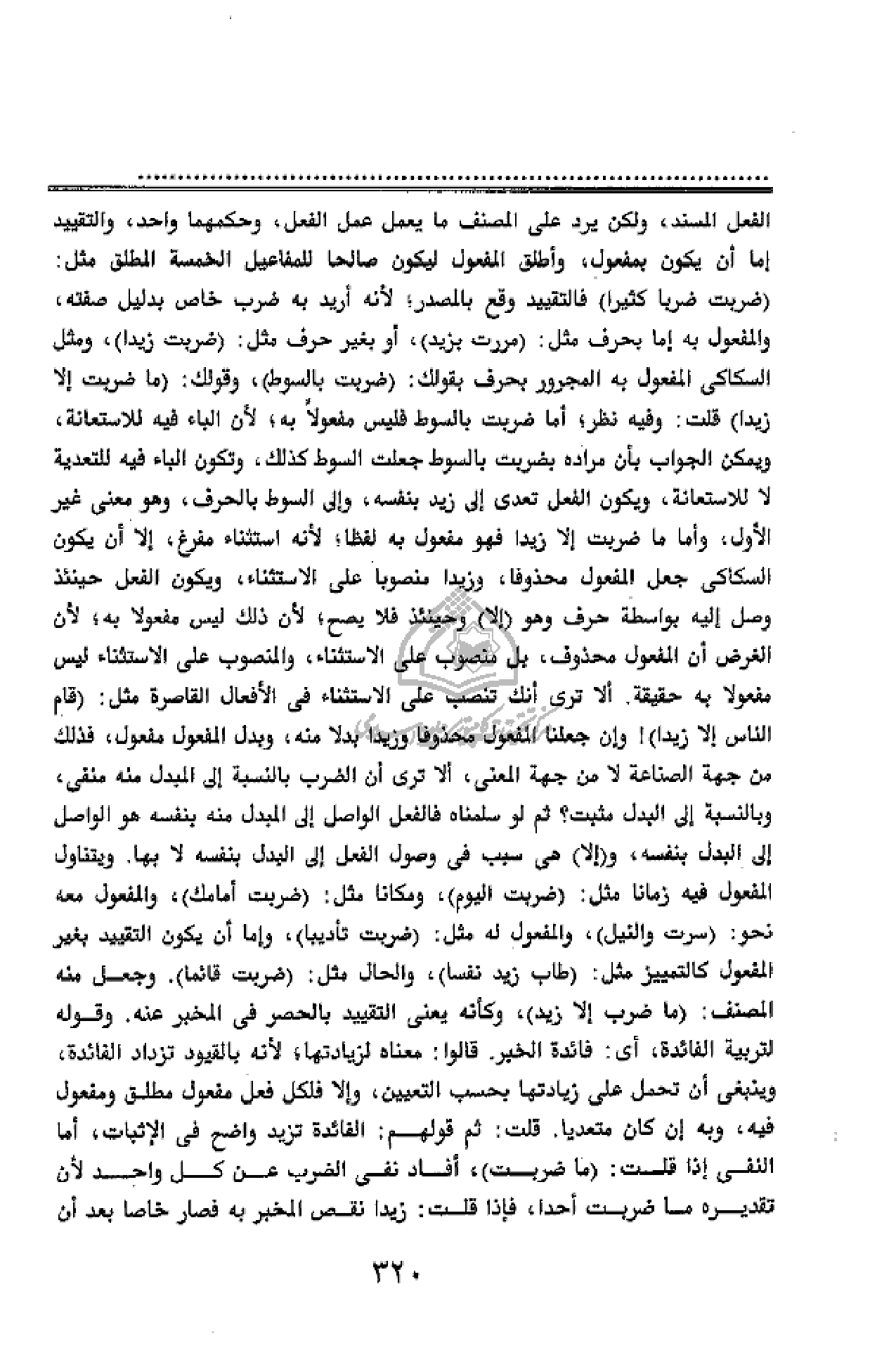 (ضربت ضربا كثيرا) فالتقييد وقع بالمصدر؛ لأنه أريد به ضرب خاص بدليل صفته، والمفعول به إما بحرف مثل: (مررت بزيد)، أو بغير حرف مثل: (ضربت زيدا)، ومثل السكاكى المفعول به المجرور بحرف بقولك: (ضربت بالسوط)، وقولك: (ما ضربت إلا زيدا) قلت: وفيه نظر؛ أما ضربت بالسوط فليس مفعولا به؛ لأن الباء فيه للاستعانة، ويمكن الجواب بأن مراده بضربت بالسوط جعلت السوط كذلك، وتكون الباء فيه للتعدية لا للاستعانة، ويكون الفعل تعدى إلى زيد بنفسه، وإلى السوط بالحرف، وهو معنى غير الأول، وأما ما ضربت إلا زيدا فهو مفعول به لفظا؛ لأنه استثناء مفرغ، إلا أن يكون السكاكى جعل المفعول محذوفا، وزيدا منصوبا على الاستثناء، ويكون الفعل حينئذ وصل إليه بواسطة حرف وهو (إلا) وحينئذ فلا يصح؛ لأن ذلك ليس مفعولا به؛ لأن الغرض أن المفعول محذوف، بل منصوب على الاستثناء، والمنصوب على الاستثناء ليس مفعولا به حقيقة. ألا ترى أنك تنصب على الاستثناء فى الأفعال القاصرة مثل: (قام الناس إلا زيدا)! وإن جعلنا المفعول محذوفا وزيدا