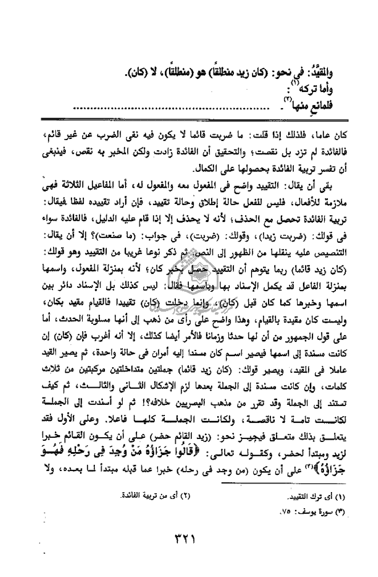 (كان زيد قائما) ربما يتوهم أن التقييد حصل بخبر كان؛ لأنه بمنزلة المفعول، واسمها بمنزلة الفاعل قد يكمل الإسناد بها وباسمها فقال: ليس كذلك بل الإسناد دائر بين اسمها وخبرها كما كان قبل (كان)، وإنما دخلت (كان) تقييدا فالقيام مقيد بكان، وليست كان مقيدة بالقيام، وهذا واضح على رأى من ذهب إلى أنها مسلوبة الحدث، أما على قول الجمهور من أن لها حدثا وزمانا فالأمر أيضا كذلك، إلا أنه أغرب فإن (كان) إن كانت مسندة إلى اسمها فيصير اسم كان مسندا إليه أمران فى حالة واحدة، ثم يصير القيد عاملا فى المقيد، ويصير قولك: (كان زيد قائما)
