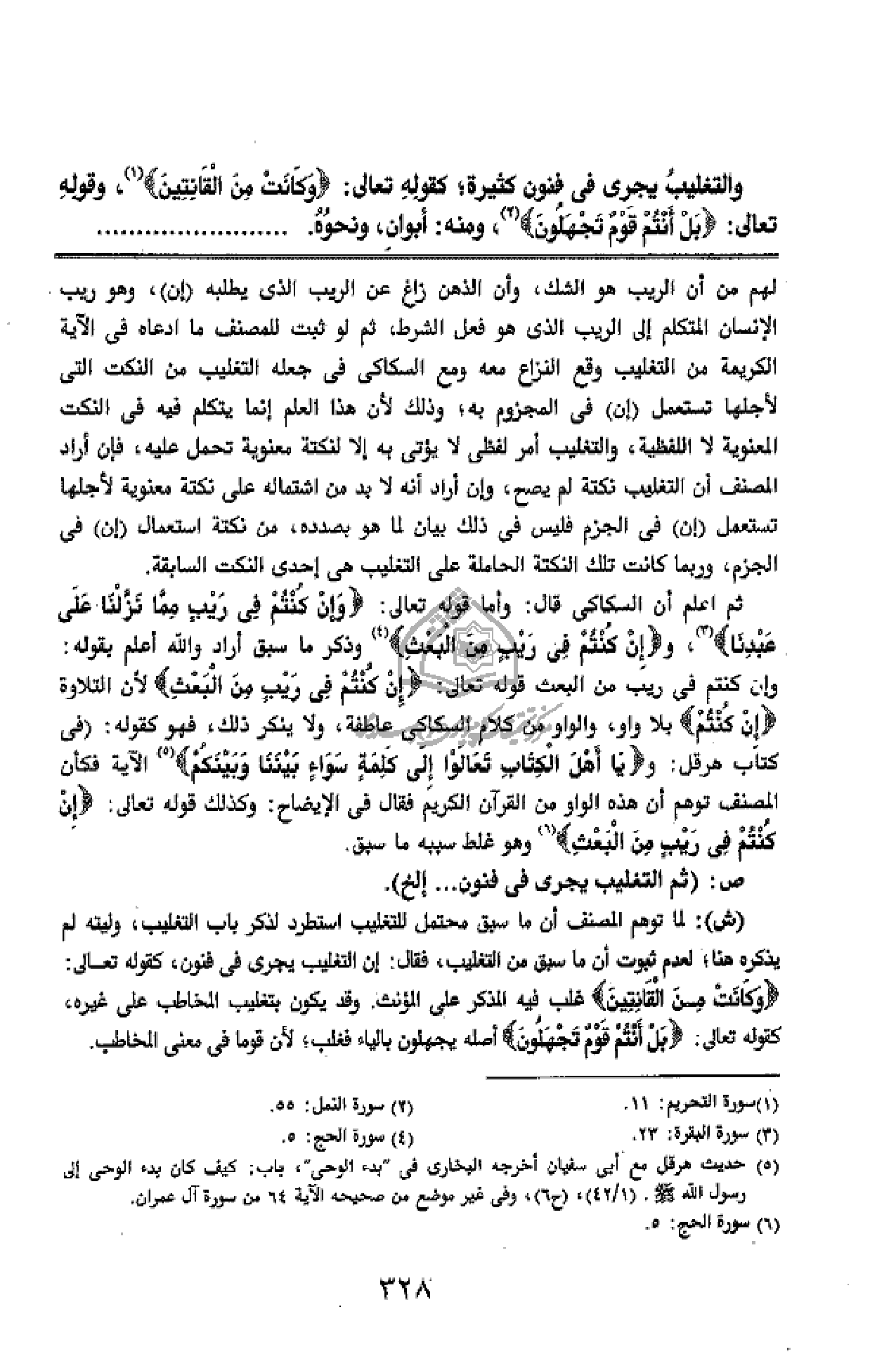 وإن كنتم فى ريب من البعث قوله تعالى: إِنْ كُنْتُمْ فِي رَيْبٍ مِنَ الْبَعْثِ لأن التلاوة إِنْ كُنْتُمْ بلا واو، والواو من كلام السكاكى عاطفة، ولا ينكر ذلك، فهو كقوله: (فى كتاب هرقل: ويا أَهْلَ الْكِتابِ تَعالَوْا إِلى كَلِمَةٍ سَواءٍ بَيْنَنا وَبَيْنَكُمْ (¬5) الآية فكأن المصنف توهم أن هذه الواو من القرآن الكريم فقال فى الإيضاح: وكذلك قوله تعالى: إِنْ كُنْتُمْ فِي رَيْبٍ مِنَ الْبَعْثِ (¬6) وهو غلط سببه ما سبق.