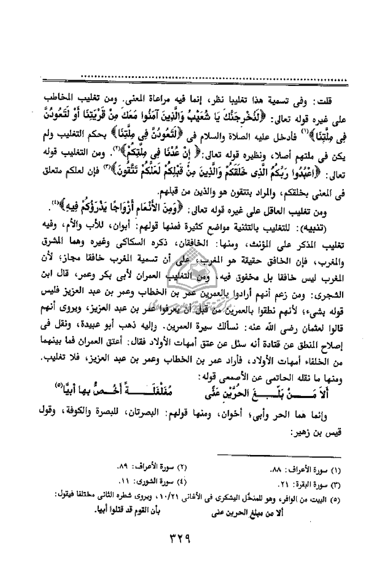 (تنبيه): للتغليب بالتثنية مواضع كثيرة فمنها قولهم: أبوان، للأب والأم، وفيه تغليب المذكر على المؤنث، ومنها: الخافقان، ذكره السكاكى وغيره وهما المشرق والمغرب، فإن الخافق حقيقة هو المغرب، على أن تسمية المغرب خافقا مجاز؛ لأن المغرب ليس خافقا بل مخفوق فيه، ومن التغليب العمران لأبى بكر وعمر، قال ابن الشجرى: ومن زعم أنهم أرادوا بالعمرين عمر بن الخطاب وعمر بن عبد العزيز فليس قوله بشئ؛ لأنهم نطقوا بالعمرين من قبل أن يعرفوا عمر بن عبد العزيز، ويروى أنهم قالوا لعثمان رضى الله عنه: نسألك سيرة العمرين، وإليه ذهب أبو عبيدة، ونقل فى إصلاح المنطق عن قتادة أنه سئل عن عتق أمهات الأولاد فقال: أعتق العمران فما بينهما من الخلفاء أمهات الأولاد، فأراد عمر بن الخطاب وعمر بن عبد العزيز، فلا تغليب.