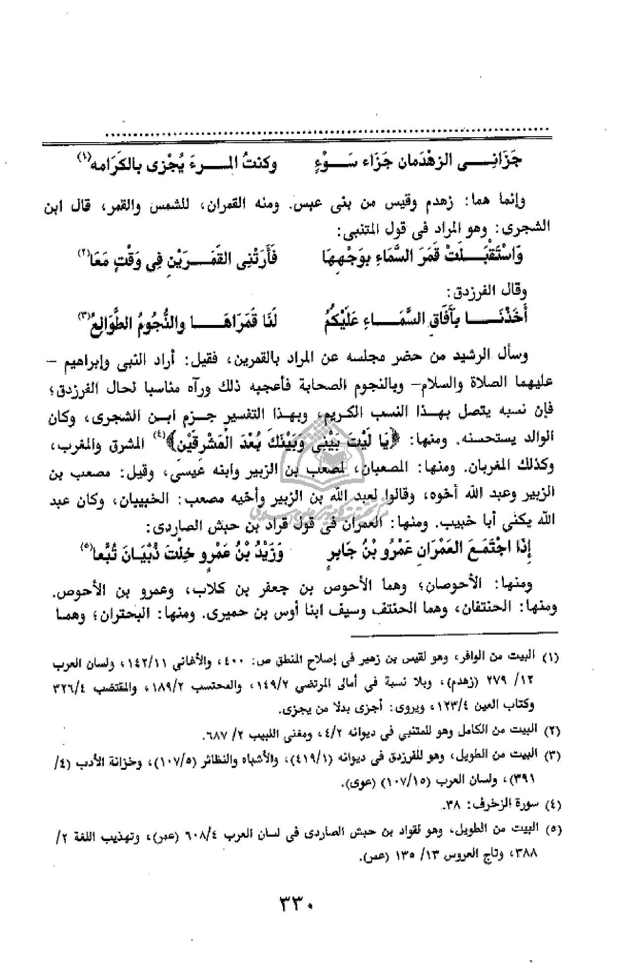 وسأل الرشيد من حضر مجلسه عن المراد بالقمرين، فقيل: أراد النبى وإبراهيم - عليهما الصلاة والسّلام - وبالنجوم الصحابة فأعجبه ذلك ورآه مناسبا لحال الفرزدق؛ فإن نسبه يتصل بهذا النسب الكريم، وبهذا التفسير جزم ابن الشجرى، وكان الوالد يستحسنه. ومنها: يا لَيْتَ بَيْنِي وَبَيْنَكَ بُعْدَ الْمَشْرِقَيْنِ (¬4) المشرق والمغرب، وكذلك المغربان. ومنها: المصعبان، لمصعب بن الزبير وابنه عيسى، وقيل: مصعب بن الزبير وعبد الله أخوه، وقالوا لعبد الله بن الزبير وأخيه مصعب: الخبيان، وكان عبد الله يكنى أبا خبيب. ومنها: العمران فى قول قراد بن حبش الصاردى: