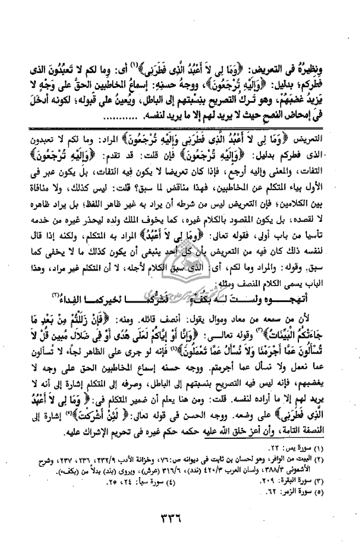 التعريض وَما لِيَ لا أَعْبُدُ الَّذِي فَطَرَنِي وَإِلَيْهِ تُرْجَعُونَ المراد: وما لكم لا تعبدون الذى فطركم بدليل: وَإِلَيْهِ تُرْجَعُونَ فإن قلت: قد تقدم: وَإِلَيْهِ تُرْجَعُونَ التفات، والمعنى وإليه أرجع، فإذا كان تعريضا لا يكون فيه التفات، بل يكون عبر فى الأول بياء المتكلم عن المخاطبين، فهذا مناقض لما سبق؟ قلت: ليس كذلك، ولا منافاة بين الكلامين؛ فإن التعريض ليس من شرطه أن يراد به غير ظاهر اللفظ؛ بل يراد ظاهره لا لقصده، بل يكون المقصود بالكلام غيره، كما يخوف الملك ولده ليحذر غيره من خدمه تأسيا من باب أولى، فقوله تعالى: وَما لِيَ لا أَعْبُدُ المراد به المتكلم، ولكنه إذا قال لنفسه ذلك كان فيه من التعريض بأن كل أحد ينبغى أن يكون كذلك ما لا يخفى كما سبق. وقوله: والمراد وما لكم، أى: الذى سبق الكلام لأجله، لا أن المتكلم غير مراد، وهذا الباب يسمى الكلام المنصف ومثله: