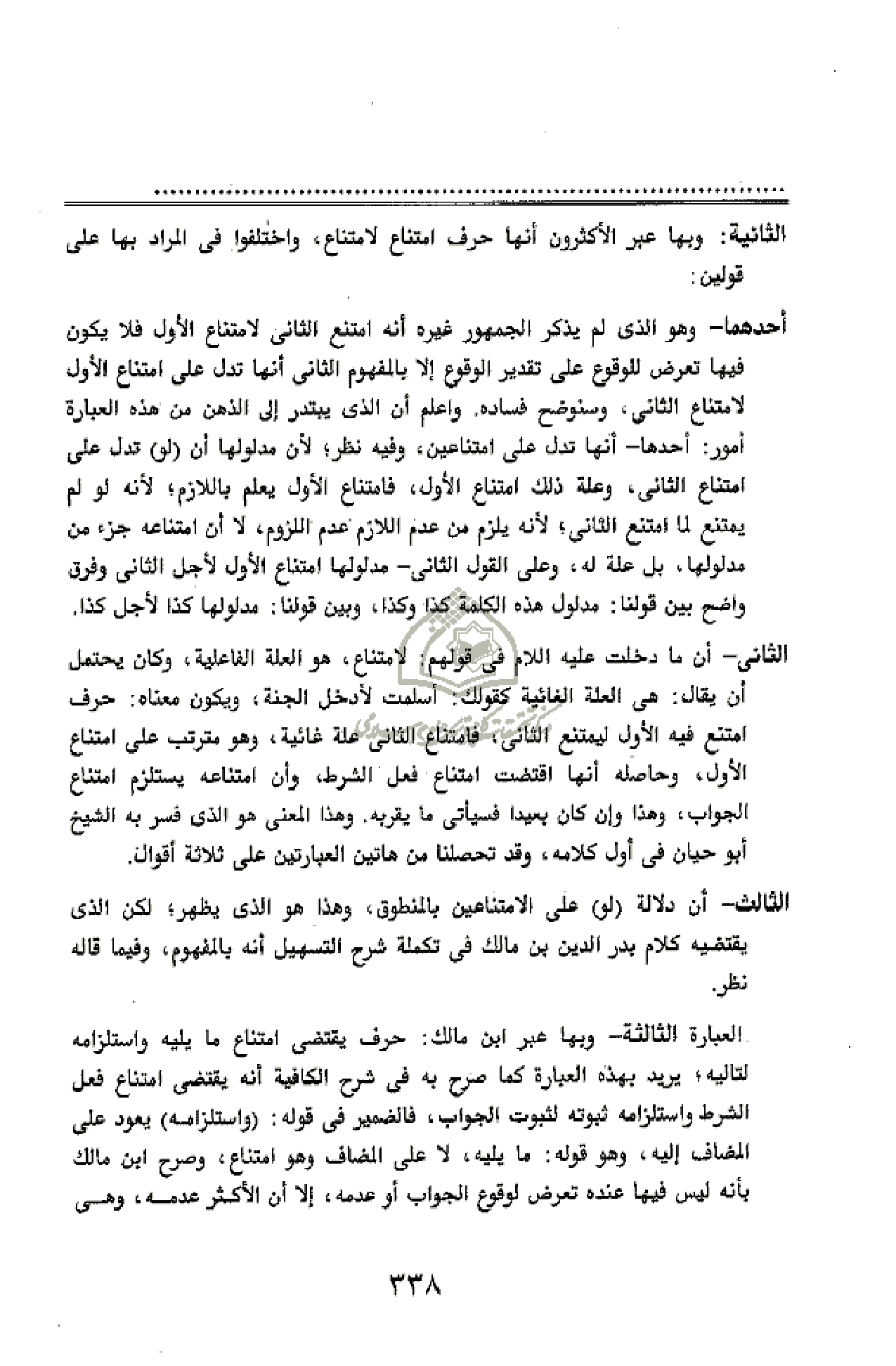 الثانى - أن ما دخلت عليه اللام فى قولهم: لامتناع، هو العلة الفاعلية، وكان يحتمل أن يقال: هى العلة الغائية كقولك: أسلمت لأدخل الجنة، ويكون معناه: حرف امتنع فيه الأول ليمتنع الثانى، فامتناع الثانى علة غائية، وهو مترتب على امتناع الأول، وحاصله أنها اقتضت امتناع فعل الشرط، وأن امتناعه يستلزم امتناع الجواب، وهذا وإن كان بعيدا فسيأتى ما يقربه. وهذا المعنى هو الذى فسر به الشيخ أبو حيان فى أول كلامه، وقد تحصلنا من هاتين العبارتين على ثلاثة أقوال.