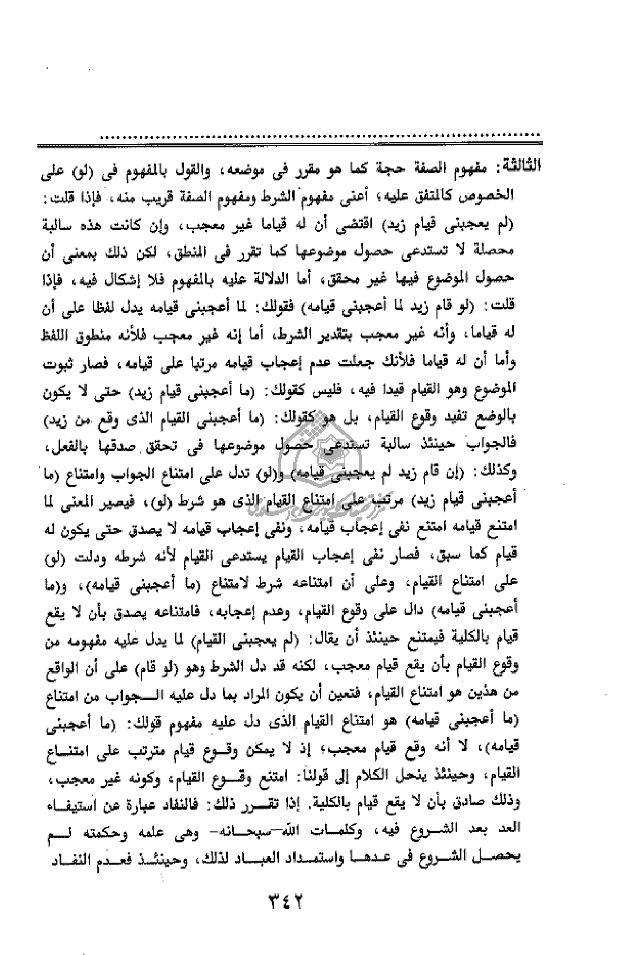 (لم يعجبنى قيام زيد) اقتضى أن له قياما غير معجب، وإن كانت هذه سالبة محصلة لا تستدعى حصول موضوعها كما تقرر فى المنطق، لكن ذلك بمعنى أن حصول الموضوع فيها غير محقق، أما الدلالة عليه بالمفهوم فلا إشكال فيه، فإذا قلت: (لو قام زيد لما أعجبنى قيامه) فقولك: لما أعجبنى قيامه يدل لفظا على أن له قياما، وأنه غير معجب بتقدير الشرط، أما إنه غير معجب فلأنه منطوق اللفظ وأما أن له قياما فلأنك جعلت عدم إعجاب قيامه مرتبا على قيامه، فصار ثبوت الموضوع وهو القيام قيدا فيه، فليس كقولك: (ما أعجبنى قيام زيد) حتى لا يكون بالوضع تفيد وقوع القيام، بل هو كقولك: (ما أعجبنى القيام الذى وقع من زيد) فالجواب حينئذ سالبة تستدعى حصول موضوعها فى تحقق صدقها بالفعل، وكذلك: (إن قام زيد لم يعجبنى قيامه) و (لو) تدل على امتناع الجواب