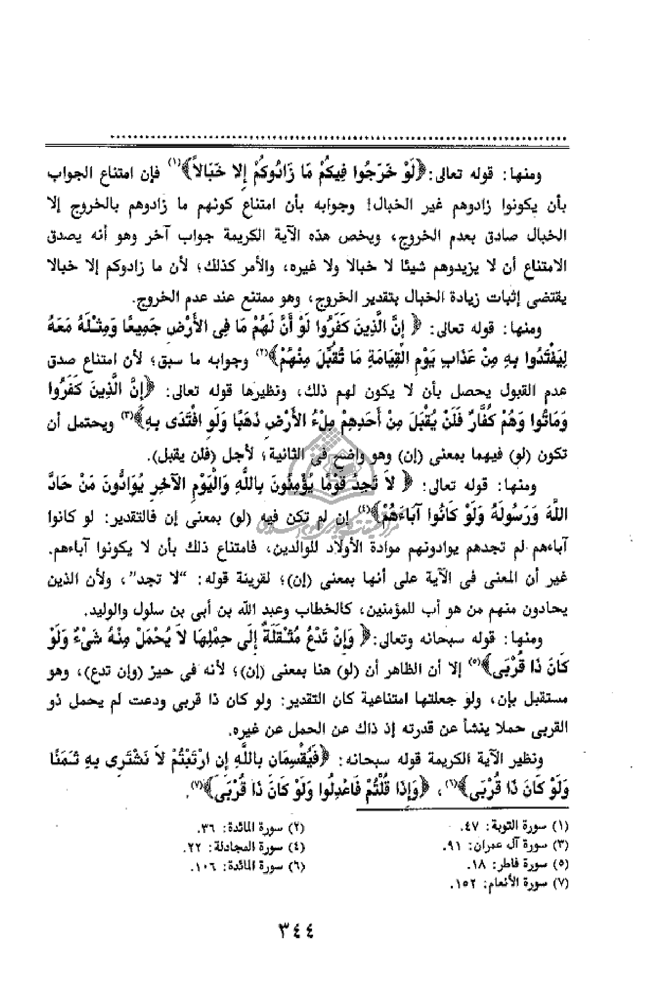 ومنها: قوله تعالى: لا تَجِدُ قَوْماً يُؤْمِنُونَ بِاللَّهِ وَالْيَوْمِ الْآخِرِ يُوادُّونَ مَنْ حَادَّ اللَّهَ وَرَسُولَهُ وَلَوْ كانُوا آباءَهُمْ (¬4) إن لم تكن فيه (لو) بمعنى إن فالتقدير: لو كانوا آباءهم لم تجدهم يوادونهم موادة الأولاد للوالدين، فامتناع ذلك بأن لا يكونوا آباءهم.