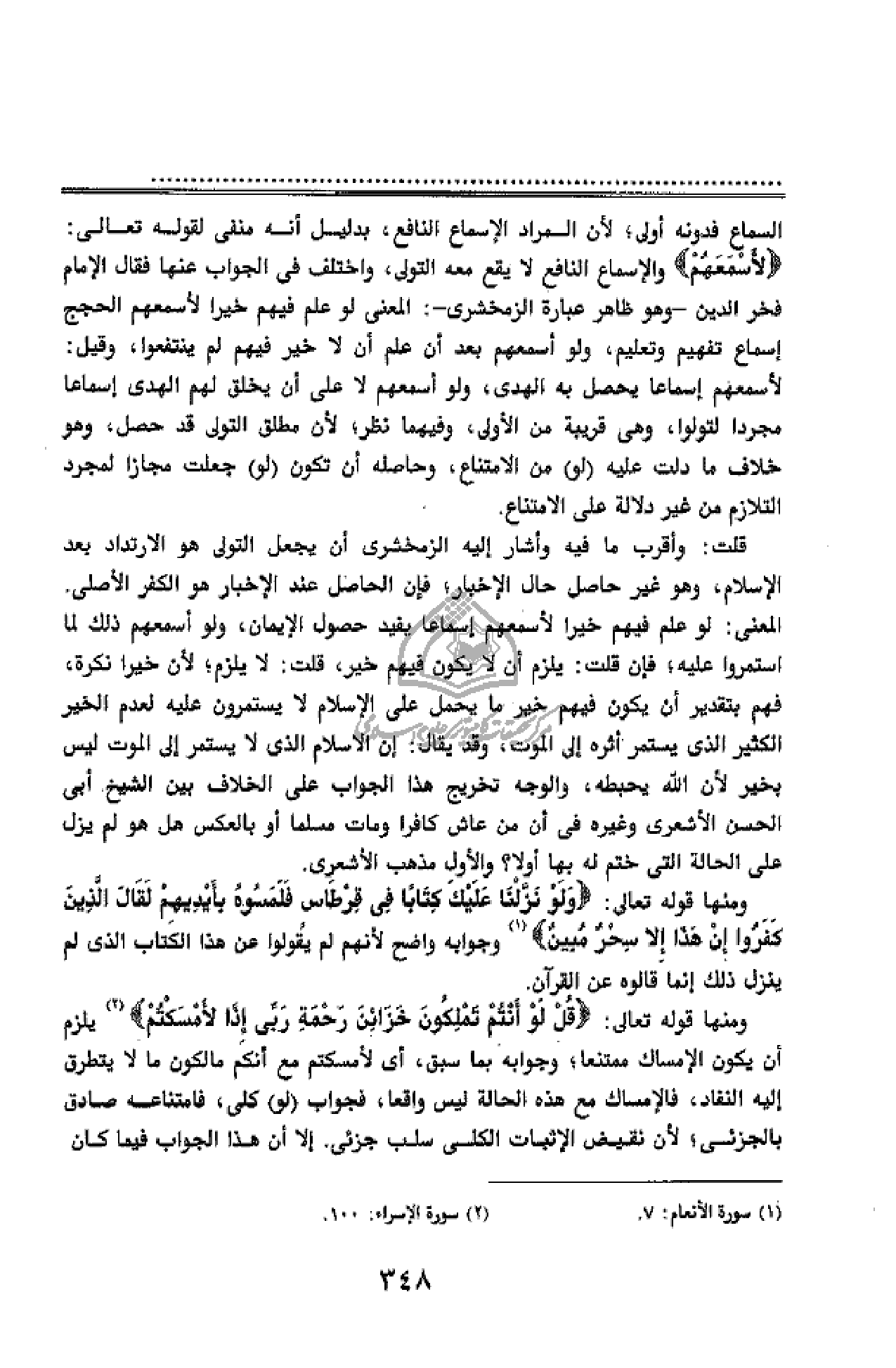 ومنها قوله تعالى: قُلْ لَوْ أَنْتُمْ تَمْلِكُونَ خَزائِنَ رَحْمَةِ رَبِّي إِذاً لَأَمْسَكْتُمْ (¬2) يلزم أن يكون الإمساك ممتنعا؛ وجوابه بما سبق، أى لأمسكتم مع أنكم مالكون ما لا يتطرق إليه النفاد، فالإمساك مع هذه الحالة ليس واقعا، فجواب (لو) كلى، فامتناعه صادق بالجزئى؛ لأن نقيض الإثبات الكلى سلب جزئى. إلا أن هذا الجواب فيما كان
