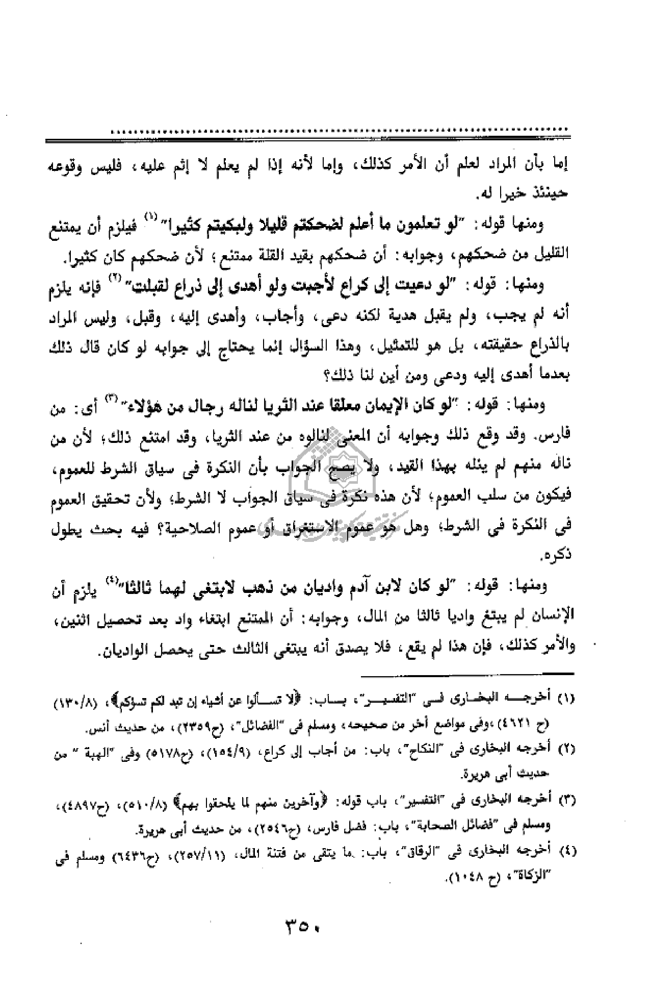 ومنها قوله:" لو تعلمون ما أعلم لضحكتم قليلا ولبكيتم كثيرا" (¬1) فيلزم أن يمتنع القليل من ضحكهم، وجوابه: أن ضحكهم بقيد القلة ممتنع؛ لأن ضحكهم كان كثيرا.