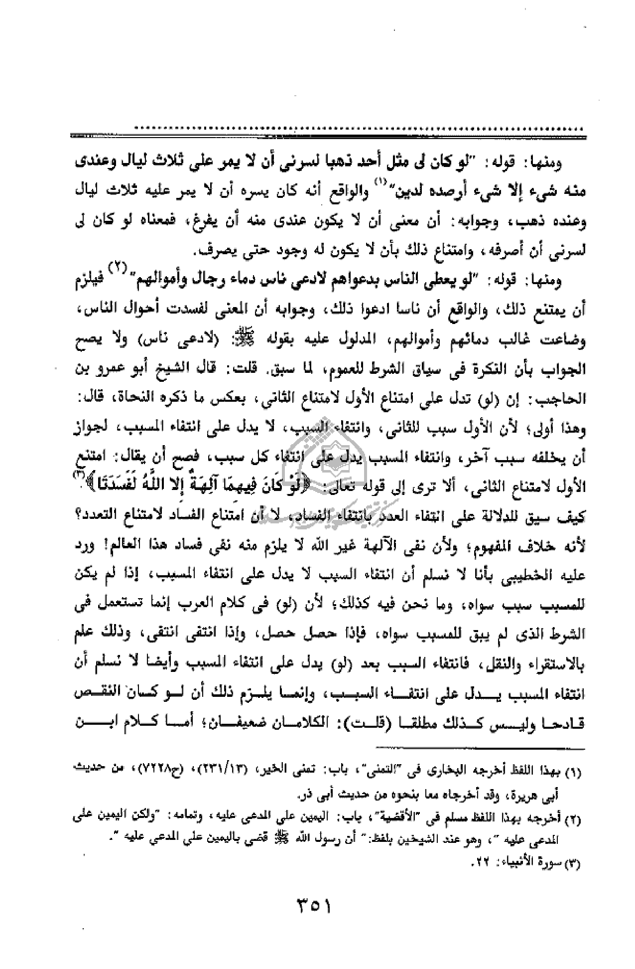 ومنها: قوله:" لو يعطى الناس بدعواهم لادعى ناس دماء رجال وأموالهم" (¬2) فيلزم أن يمتنع ذلك، والواقع أن ناسا ادعوا ذلك، وجوابه أن المعنى لفسدت أحوال الناس، وضاعت غالب دمائهم وأموالهم، المدلول عليه بقوله صلّى الله عليه وسلّم: (لادعى ناس) ولا يصح الجواب بأن النكرة فى سياق الشرط للعموم، لما سبق. قلت: قال الشيخ أبو عمرو بن الحاجب: إن (لو) تدل على امتناع الأول لامتناع الثانى، بعكس ما ذكره النحاة، قال: