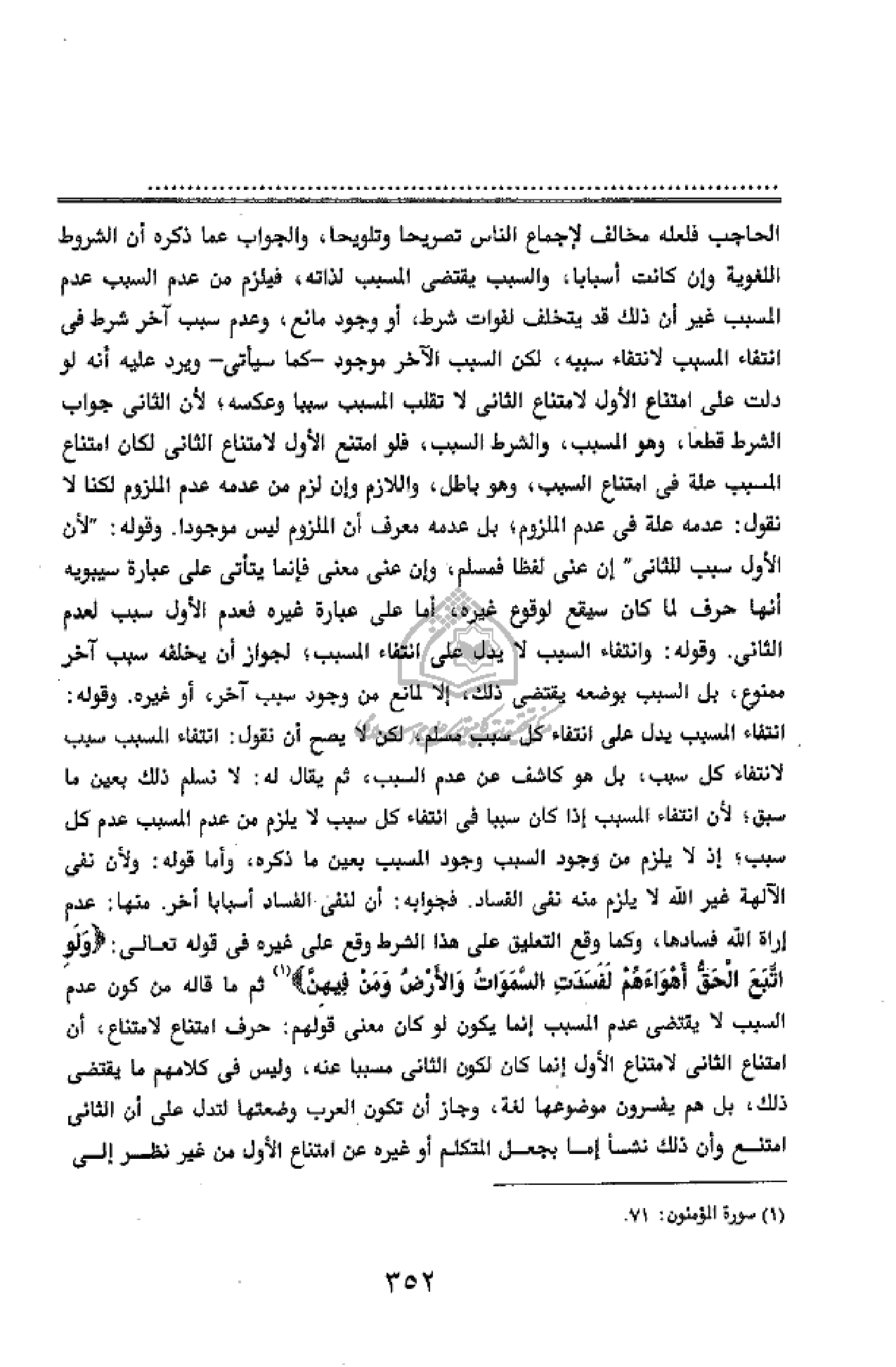 انتفاء المسبب يدل على انتفاء كل سبب مسلم، لكن لا يصح أن نقول: انتفاء المسبب سبب لانتفاء كل سبب، بل هو كاشف عن عدم السبب، ثم يقال له: لا نسلم ذلك بعين ما سبق؛ لأن انتفاء المسبب إذا كان سببا فى انتفاء كل سبب لا يلزم من عدم المسبب عدم كل سبب؛ إذ لا يلزم من وجود السبب وجود المسبب بعين ما ذكره، وأما قوله: ولأن نفى الآلهة غير الله لا يلزم منه نفى الفساد. فجوابه: أن لنفى الفساد أسبابا أخر. منها: عدم إراة الله فسادها، وكما وقع التعليق على هذا الشرط وقع على غيره فى قوله تعالى: وَلَوِ اتَّبَعَ الْحَقُّ أَهْواءَهُمْ لَفَسَدَتِ السَّماواتُ وَالْأَرْضُ وَمَنْ فِيهِنَّ (¬1) ثم ما قاله من كون عدم السبب لا يقتضى عدم المسبب إنما يكون لو كان معنى قولهم: حرف امتناع لامتناع، أن امتناع الثانى لامتناع الأول إنما كان لكون الثانى مسببا عنه، وليس فى كلامهم ما يقتضى ذلك، بل هم يفسرون موضوعها لغة، وجاز أن تكون العرب وضعتها لتدل على أن الثانى امتنع وأن ذلك نشأ إما بجعل المتكلم أو غيره عن امتناع الأول من غير نظر إلى