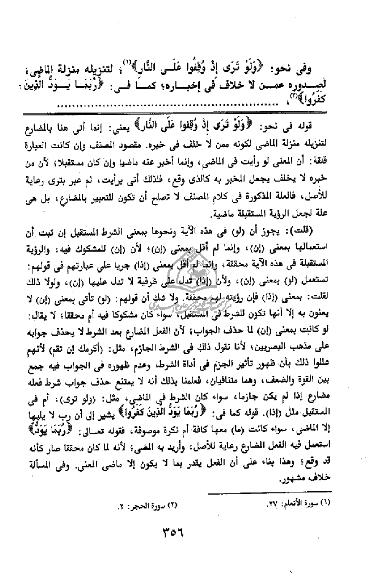 لو كانت بمعنى (إن) لما حذف الجواب؛ لأن الفعل المضارع بعد الشرط لا يحذف جوابه على مذهب البصريين؛ لأنا نقول ذلك فى الشرط الجازم، مثل: (أكرمك إن تقم) لأنهم عللوا ذلك بأن ظهور تأثير الجزم فى أداة الشرط، وعدم ظهوره فى الجواب فيه جمع بين القوة والضعف، وهما متنافيان، فعلمنا بذلك أنه لا يمتنع حذف جواب شرط فعله مضارع إذا لم يكن جازما، سواء كان الشرط فى الماضى، مثل: (ولو ترى)، أم فى المستقبل مثل (إذا). قوله كما فى: رُبَما يَوَدُّ الَّذِينَ كَفَرُوا يشير إلى أن رب لا يليها إلا الماضى، سواء كانت (ما) معها كافة أم نكرة موصوفة، فقوله تعالى: رُبَما يَوَدُّ استعمل فيه الفعل المضارع رعاية للأصل، وأريد به المضى؛ لأنه لما كان محققا صار كأنه قد وقع؛ وهذا بناء على أن الفعل يقدر بما لا يكون إلا ماضى المعنى. وفى المسألة خلاف مشهور.