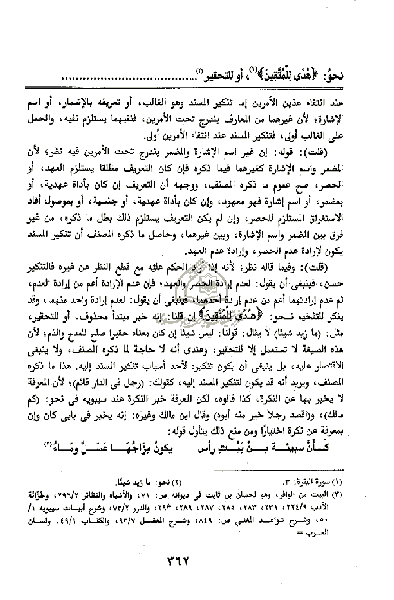 (قلت): وفيما قاله نظر؛ لأنه إذا أراد الحكم عليه مع قطع النظر عن غيره فالتنكير حسن، فينبغى أن يقول: لعدم إرادة الحصر والعهد؛ فإن عدم الإرادة أعم من إرادة العدم، ثم عدم إرادتهما أعم من عدم إرادة أحدهما؛ فينبغى أن يقول: لعدم إرادة واحد منهما، وقد ينكر للتفخيم نحو: هُدىً لِلْمُتَّقِينَ إن قلنا: إنه خبر مبتدأ محذوف، أو للتحقير، مثل: (ما زيد شيئا) لا يقال: قولنا: ليس شيئا إن كان معناه حقيرا صلح للمدح والذم؛ لأن هذه الصيغة لا تستعمل إلا