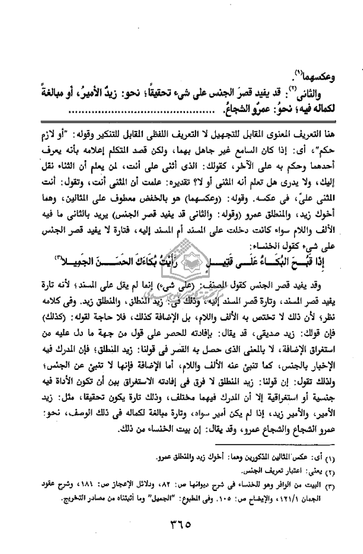 وقد يفيد قصر الجنس كقول المصنف: (على شئ) إنما لم يقل على المسند؛ لأنه تارة يفيد قصر المسند، وتارة قصر المسند إليه، وذلك فى: زيد المنطلق، والمنطلق زيد. وفى كلامه نظر؛ لأن ذلك لا تختص به الألف واللام، بل الإضافة كذلك، فلا حاجة لقوله: (كذلك) فإن قولك: زيد صديقى، قد يقال: بإفادته للحصر على قول من جهة ما دل عليه من استغراق الإضافة، لا بالمعنى الذى حصل به القصر فى قولنا: زيد المنطلق؛ فإن المدرك فيه الإخبار