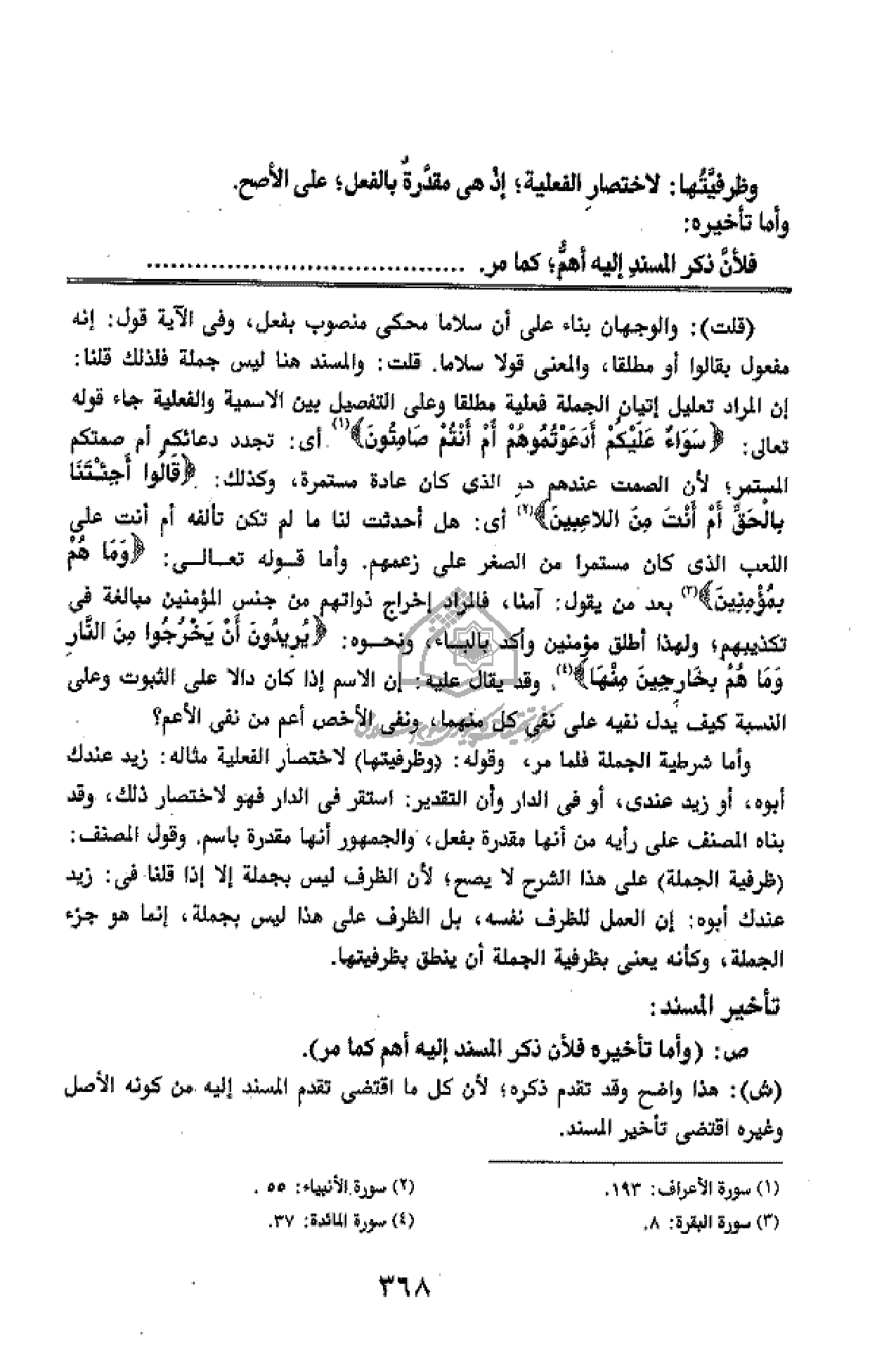 إن المراد تعليل إتيان الجملة فعلية مطلقا وعلى التفصيل بين الاسمية والفعلية جاء قوله تعالى: سَواءٌ عَلَيْكُمْ أَدَعَوْتُمُوهُمْ أَمْ أَنْتُمْ صامِتُونَ (¬1) أى: تجدد دعائكم أم صمتكم المستمر؛ لأن الصمت عندهم هو الذى كان عادة مستمرة، وكذلك: قالُوا أَجِئْتَنا بِالْحَقِّ أَمْ أَنْتَ مِنَ اللَّاعِبِينَ (¬2) أى: هل أحدثت لنا ما لم تكن تألفه أم أنت على اللعب الذى كان مستمرا من الصغر على زعمهم. وأما قوله تعالى: وَما هُمْ بِمُؤْمِنِينَ (¬3) بعد من يقول: آمنا، فالمراد إخراج ذواتهم من جنس المؤمنين مبالغة فى تكذيبهم؛ ولهذا أطلق مؤمنين وأكد بالباء، ونحوه: يُرِيدُونَ أَنْ يَخْرُجُوا مِنَ النَّارِ وَما هُمْ بِخارِجِينَ مِنْها (¬4). وقد يقال عليه: إن الاسم إذا كان دالا على الثبوت وعلى النسبة كيف يدل نفيه على نفى كل منهما، ونفى الأخص أعم من نفى الأعم؟