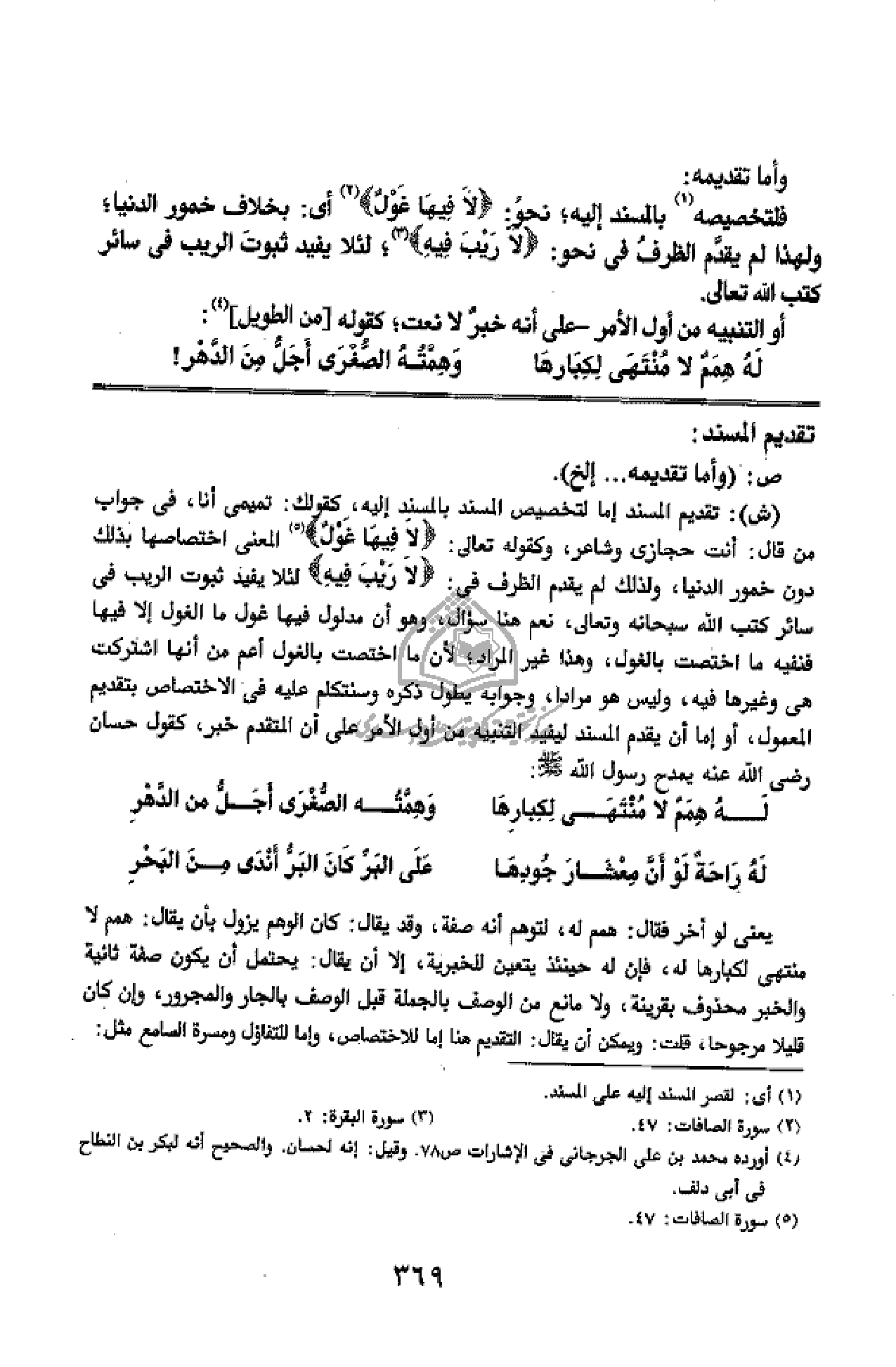 فلتخصيصه (¬1) بالمسند إليه؛ نحو: لا فِيها غَوْلٌ (¬2) أى: بخلاف خمور الدنيا؛ ولهذا لم يقدّم الظرف فى نحو: لا رَيْبَ فِيهِ (¬3)؛ لئلا يفيد ثبوت الريب فى سائر كتب الله تعالى.