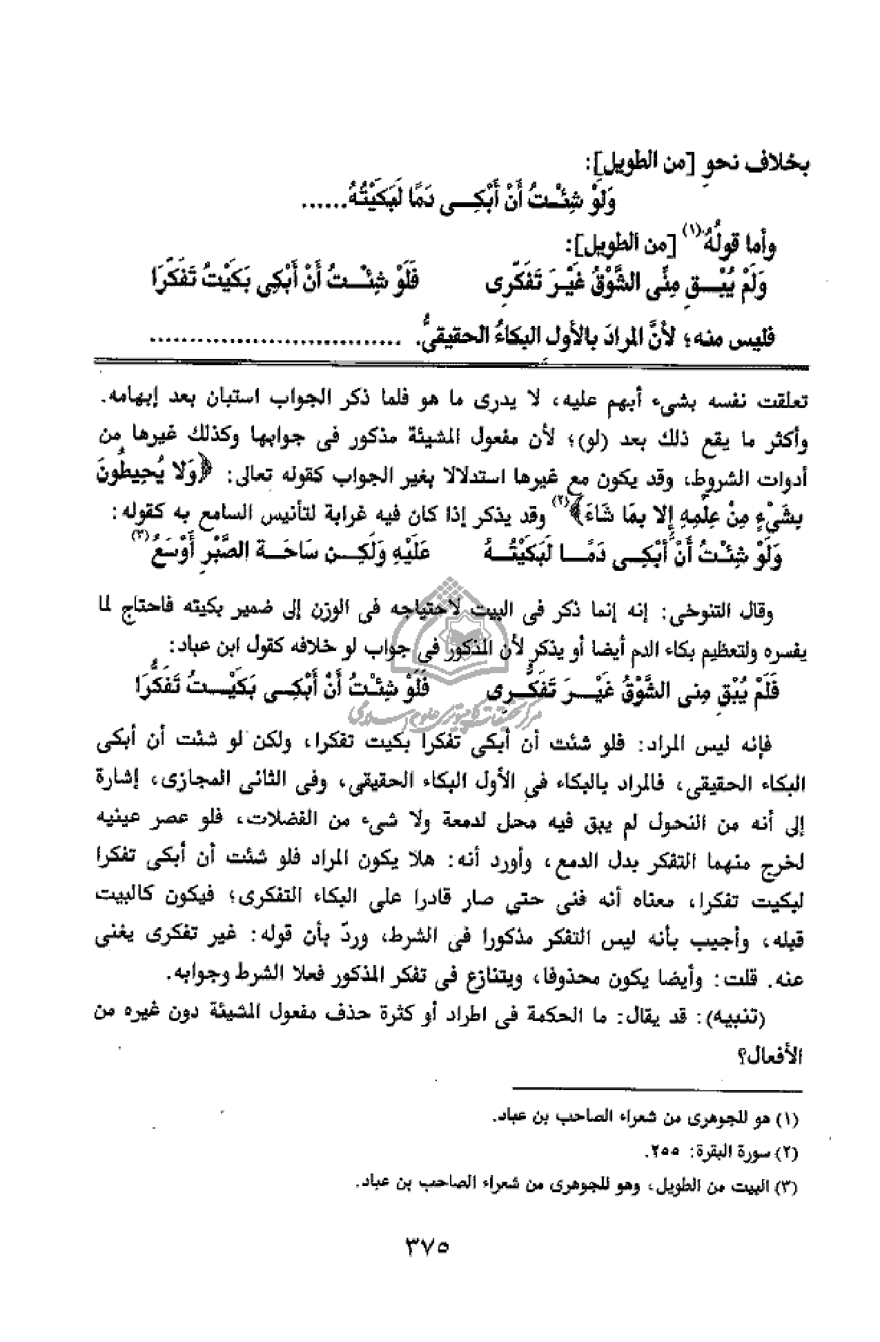 وقال التنوخى: إنه إنما ذكر فى البيت لاحتياجه فى الوزن إلى ضمير بكيته فاحتاج لما يفسره ولتعظيم بكاء الدم أيضا أو يذكر لأن المذكور فى جواب لو خلافه كقول ابن عباد: