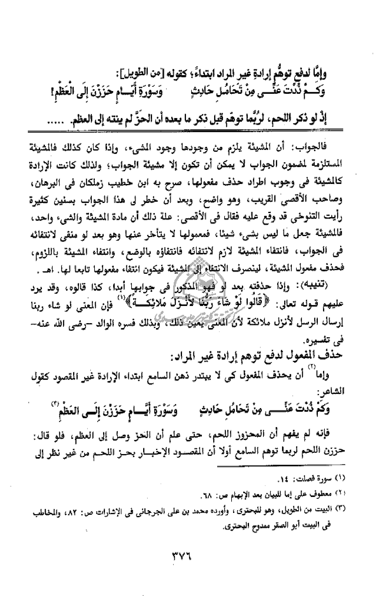 فالجواب: أن المشيئة يلزم من وجودها وجود المشئ، وإذا كان كذلك فالمشيئة المستلزمة لمضمون الجواب لا يمكن أن تكون إلا مشيئة الجواب؛ ولذلك كانت الإرادة كالمشيئة فى وجوب اطراد حذف مفعولها، صرح به ابن خطيب زملكان فى البرهان، وصاحب الأقصى القريب، وهو واضح، وبعد أن خطر لى هذا الجواب بسنين كثيرة رأيت التنوخى قد وقع عليه فقال فى الأقصى: علة ذلك أن مادة المشيئة والشئ واحد، فالمشيئة جعل ما ليس بشئ شيئا، فمعمولها لا يتأخر عنها وهو بعد لو منفى لانتفائه فى الجواب، فانتفاء المشيئة لازم لانتفائه فانتفاؤه بالوضع، وانتفاء المشيئة باللزوم، فحذف مفعول المشيئة، لينصرف الانتفاء إلى المشيئة فيكون انتفاء مفعولها تابعا لها. اه.