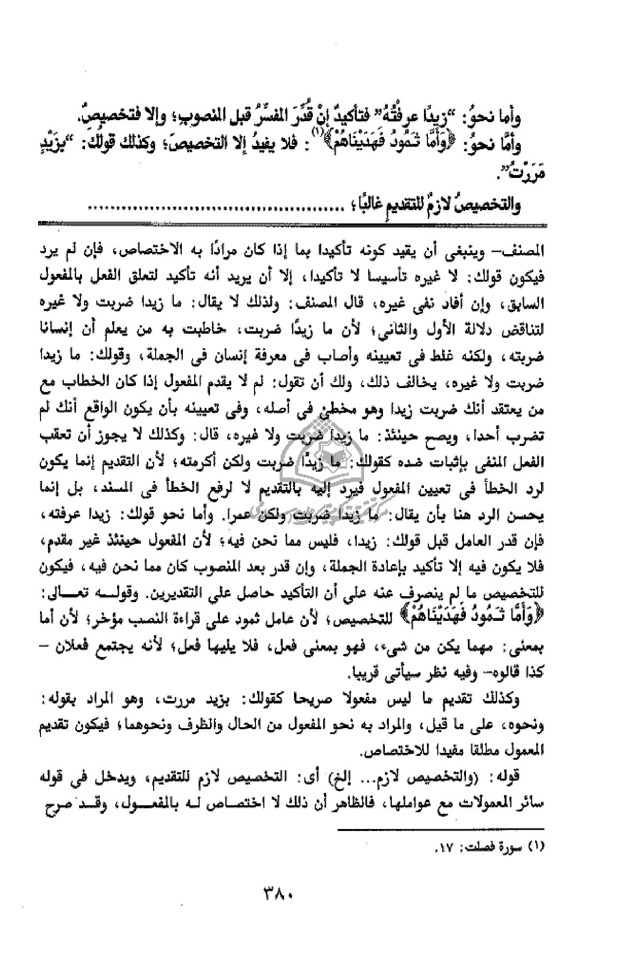 وأمّا نحو: وَأَمَّا ثَمُودُ فَهَدَيْناهُمْ (¬1): فلا يفيد إلا التخصيص؛ وكذلك قولك: بزيد مررت خ خ.