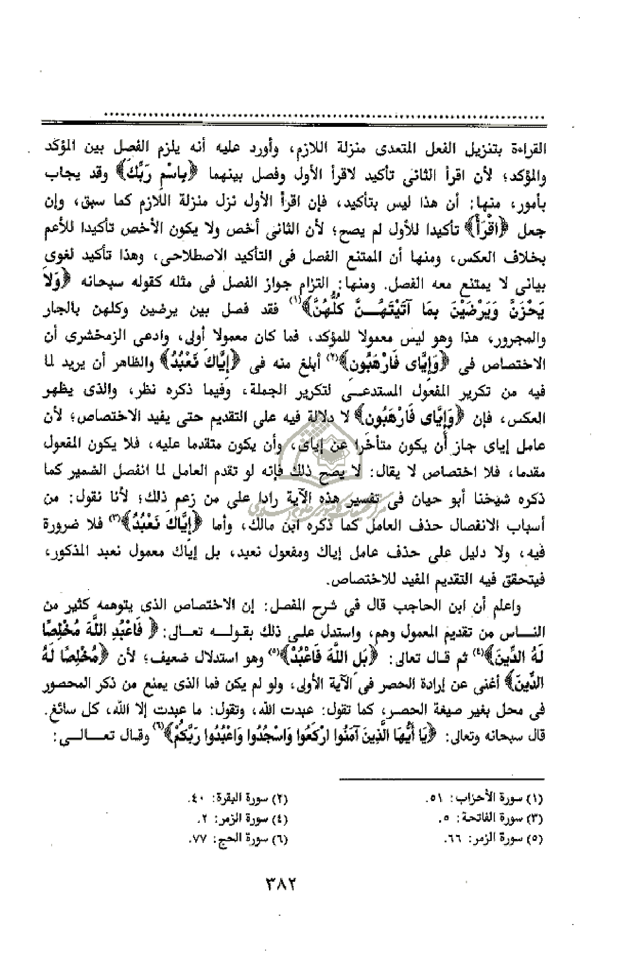 واعلم أن ابن الحاجب قال فى شرح المفصل: إن الاختصاص الذى يتوهمه كثير من الناس من تقديم المعمول وهم، واستدل على ذلك بقوله تعالى: فَاعْبُدِ اللَّهَ مُخْلِصاً لَهُ الدِّينَ (¬4) ثم قال تعالى: بَلِ اللَّهَ فَاعْبُدْ (¬5) وهو استدلال