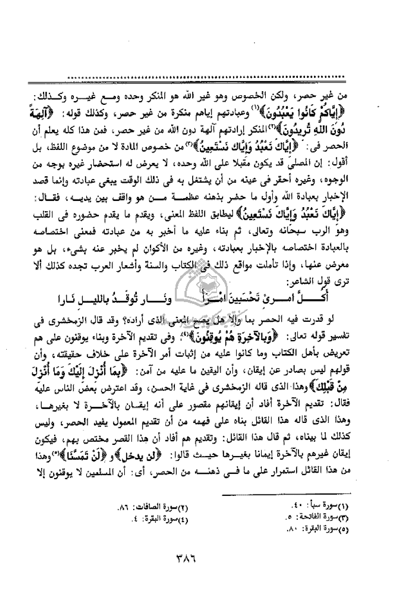 إِيَّاكُمْ كانُوا يَعْبُدُونَ (¬1) وعبادتهم إياهم منكرة من غير حصر، وكذلك قوله: آلِهَةً دُونَ اللَّهِ تُرِيدُونَ (¬2) المنكر إرادتهم آلهة دون الله من غير حصر، فمن هذا كله يعلم أن الحصر فى: إِيَّاكَ نَعْبُدُ وَإِيَّاكَ نَسْتَعِينُ (¬3) من خصوص المادة لا من موضوع اللفظ، بل أقول: إن المصلى قد يكون مقبلا على الله وحده، لا يعرض له استحضار غيره بوجه من الوجوه، وغيره أحقر فى عينه من أن يشتغل به فى ذلك الوقت يبغى عبادته وإنما قصد الإخبار بعبادة الله وأول ما حضر بذهنه عظمة من هو واقف بين يديه، فقال: