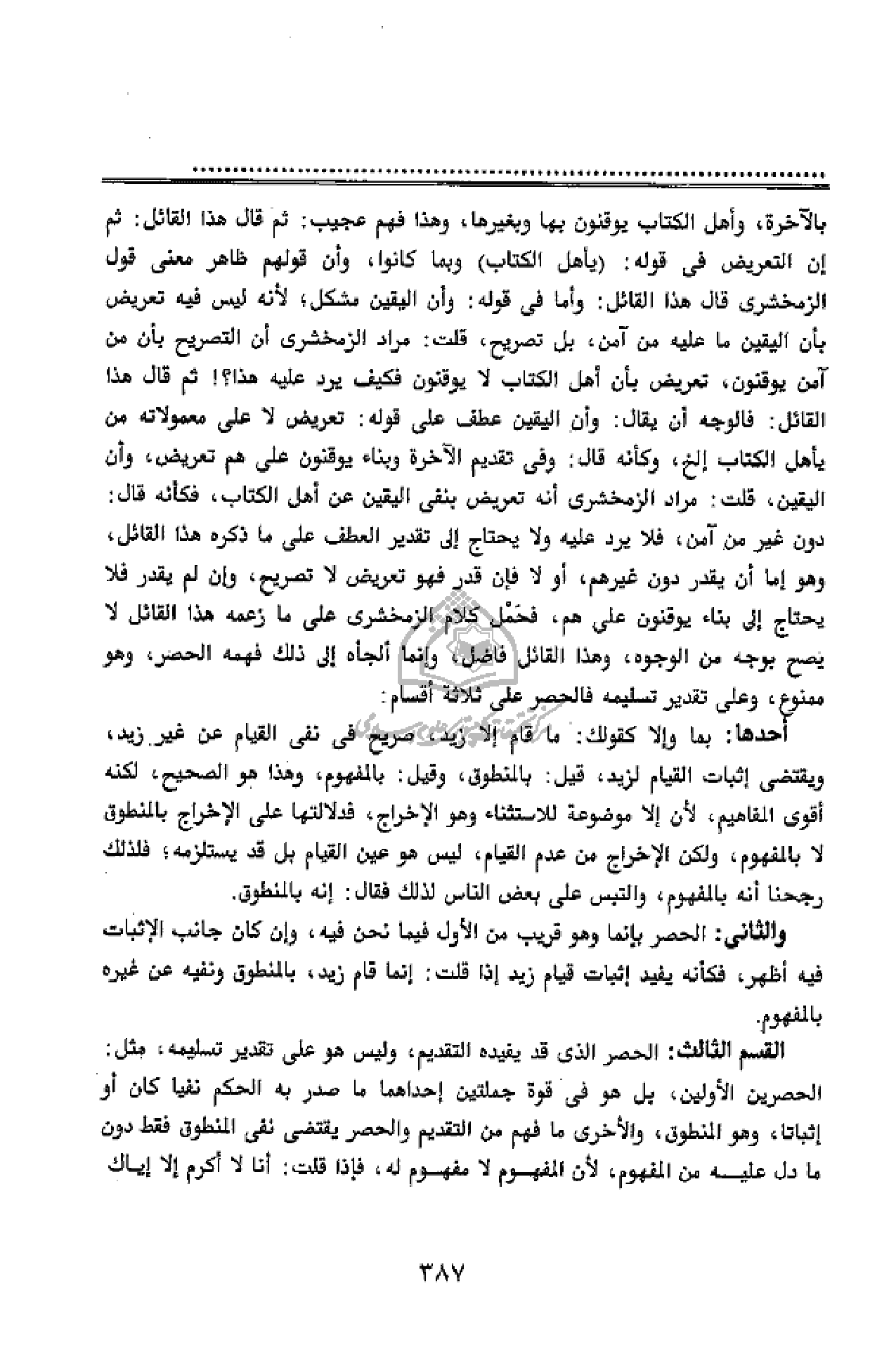 أو لا فإن قدر فهو تعريض لا تصريح، وإن لم يقدر فلا يحتاج إلى بناء يوقنون على هم، فحمل كلام الزمخشرى على ما زعمه هذا القائل لا يصح بوجه من الوجوه، وهذا القائل فاضل، وإنما ألجأه إلى ذلك فهمه الحصر، وهو ممنوع، وعلى تقدير تسليمه فالحصر على ثلاثة أقسام: