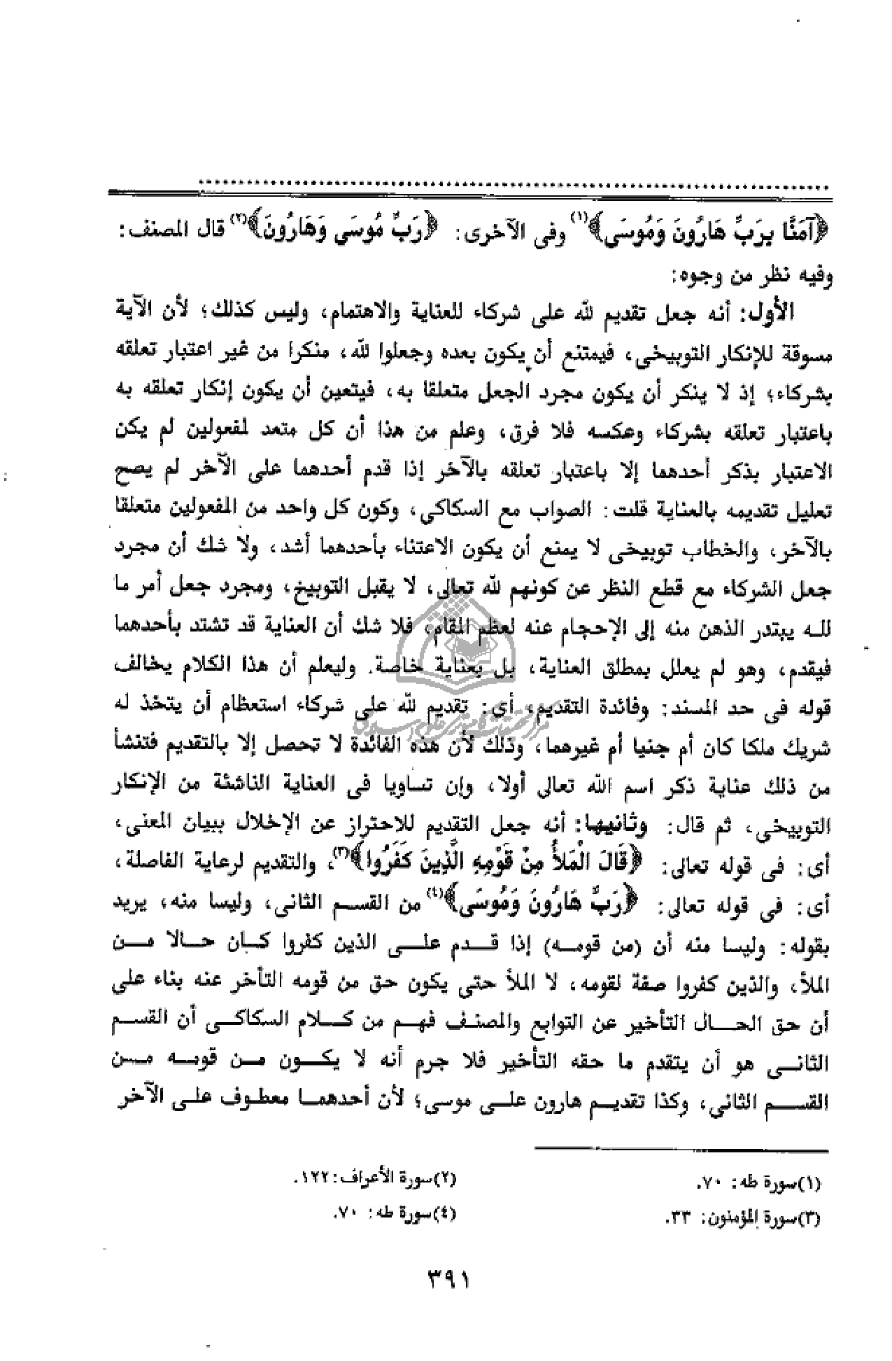 والتقديم لرعاية الفاصلة، أى: فى قوله تعالى: رب هارُونَ وَمُوسى (¬4) من القسم الثانى، وليسا منه، يريد بقوله: وليسا منه أن (من قومه) إذا قدم على الذين كفروا كان حالا من الملأ، والذين كفروا صفة لقومه، لا الملأ حتى يكون حق من قومه التأخر عنه بناء على أن حق الحال التأخير عن التوابع والمصنف فهم من كلام السكاكى أن القسم الثانى هو أن يتقدم ما حقه التأخير فلا جرم أنه لا يكون من قومه من القسم الثانى، وكذا تقديم هارون على موسى؛ لأن أحدهما معطوف على الآخر