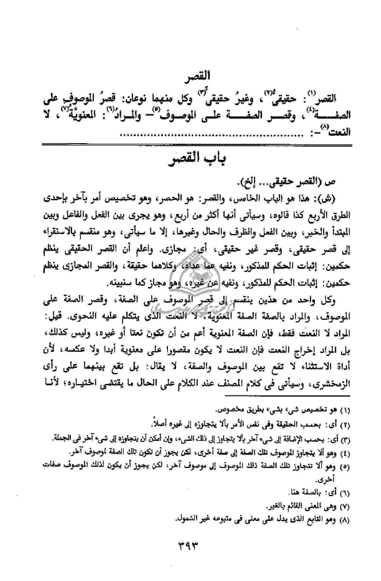 وكل واحد من هذين ينقسم إلى قصر الموصوف على الصفة، وقصر الصفة على الموصوف، والمراد بالصفة الصفة المعنوية، لا النعت الذى يتكلم عليه النحوى. قيل: